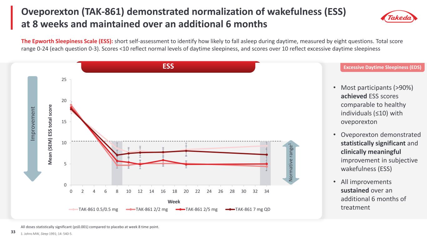 Oveporexton (TAK-861) demonstrated normalization of wakefulness (MWT) at 8 weeks and maintained over an additional 6 months • Oveporexton normalized sleep latency on MWT • Sustained improvements in wakefulness in NT1 patients over an additional 6 months of treatment The Maintenance of Wakefulness Test (MWT): daytime polysomnographic procedure which quantifies wake tendency by measuring ability to remain awake during soporific circumstances (sleepiness condition such as dark quiet room) 6.1 4.75.6 16.5 22.0 3.9 27.6 28.9 4.2 30.7 22.6 3.7 19.5 24.7 0 5 10 15 20 25 30 35 40 M ea n (S EM ) S le ep O ns et L at en cy , m in Placebo (n=22) TAK-861 0.5 mg/0.5 mg (n=23) TAK-861 2 mg/2 mg (n=21) TAK-861 2 mg/5 mg (n=23) TAK-861 7 mg QD (n=23) Baseline Week 34Week 8 MWT N or m at iv e ra ng e1 1. Doghramji K, et al. ,Electroencephalogr Clin Neurophysiol 1997; 103: 554-62. ***p≤0.001, all doses statistically significant compared to placebo at week 8 time point. *** *** *** *** Excessive Daytime Sleepiness (EDS) Im pr ov em en t 32