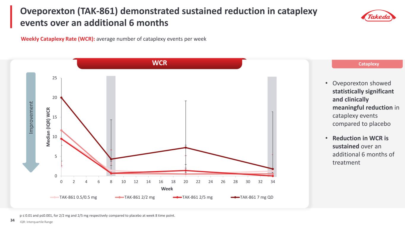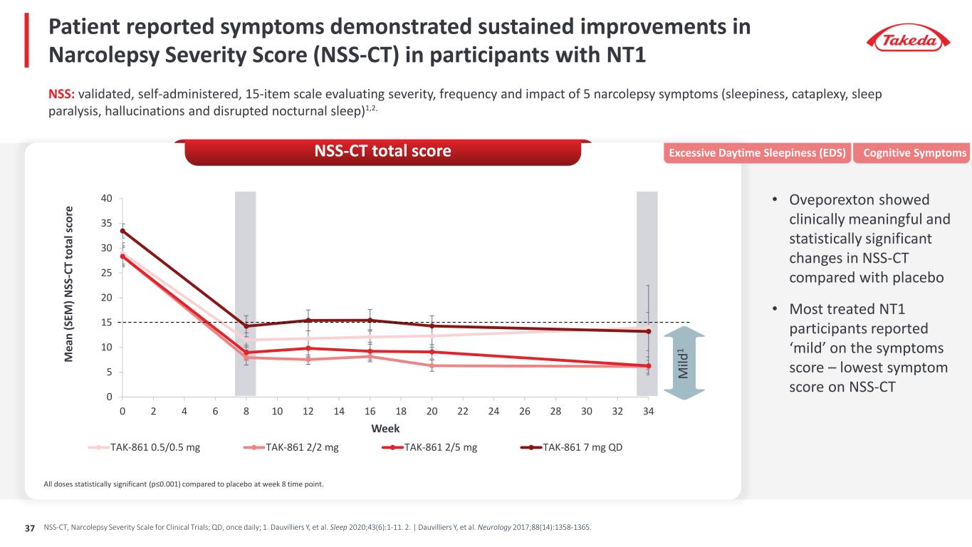 0 5 10 15 20 25 0 2 4 6 8 10 12 14 16 18 20 22 24 26 28 30 32 34 M ea n (S EM ) E SS to ta l s co re Week TAK-861 0.5/0.5 mg TAK-861 2/2 mg TAK-861 2/5 mg TAK-861 7 mg QD Oveporexton (TAK-861) demonstrated normalization of wakefulness (ESS) at 8 weeks and maintained over an additional 6 months N or m at iv e ra ng e1 1. Johns MW, Sleep 1991; 14: 540-5. The Epworth Sleepiness Scale (ESS): short self-assessment to identify how likely to fall asleep during daytime, measured by eight questions. Total score range 0-24 (each question 0-3). Scores <10 reflect normal levels of daytime sleepiness, and scores over 10 reflect excessive daytime sleepiness • Most participants (>90%) achieved ESS scores comparable to healthy individuals (≤10) with oveporexton • Oveporexton demonstrated statistically significant and clinically meaningful improvement in subjective wakefulness (ESS) • All improvements sustained over an additional 6 months of treatment Excessive Daytime Sleepiness (EDS)ESS Im pr ov em en t All doses statistically significant (p≤0.001) compared to placebo at week 8 time point. 33