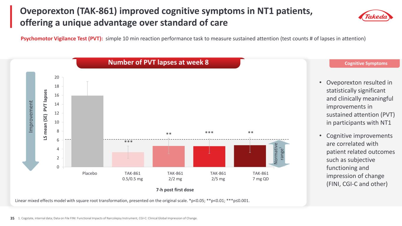 Oveporexton (TAK-861) demonstrated sustained reduction in cataplexy events over an additional 6 months IQR: Interquartile Range 0 5 10 15 20 25 0 2 4 6 8 10 12 14 16 18 20 22 24 26 28 30 32 34 M ed ia n (IQ R) W CR Week TAK-861 0.5/0.5 mg TAK-861 2/2 mg TAK-861 2/5 mg TAK-861 7 mg QD Weekly Cataplexy Rate (WCR): average number of cataplexy events per week • Oveporexton showed statistically significant and clinically meaningful reduction in cataplexy events compared to placebo • Reduction in WCR is sustained over an additional 6 months of treatment CataplexyWCR Im pr ov em en t p ≤ 0.01 and p≤0.001, for 2/2 mg and 2/5 mg respectively compared to placebo at week 8 time point. 34