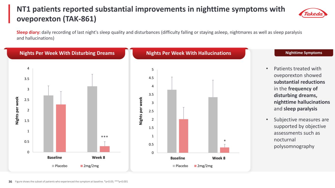 NT1 patients reported substantial improvements in nighttime symptoms with oveporexton (TAK-861) 0 0.5 1 1.5 2 2.5 3 3.5 4 Baseline Week 8 N ig ht s p er w ee k Placebo 2mg/2mg 0 0.5 1 1.5 2 2.5 3 3.5 4 4.5 5 Baseline Week 8 N ig ht s p er w ee k Placebo 2mg/2mg *** * Sleep diary: daily recording of last night's sleep quality and disturbances (difficulty falling or staying asleep, nightmares as well as sleep paralysis and hallucinations) • Patients treated with oveporexton showed substantial reductions in the frequency of disturbing dreams, nighttime hallucinations and sleep paralysis • Subjective measures are supported by objective assessments such as nocturnal polysomnography Nighttime SymptomsNights Per Week With HallucinationsNights Per Week With Disturbing Dreams Figure shows the subset of patients who experienced the symptom at baseline. *p<0.05; ***p<0.00136
