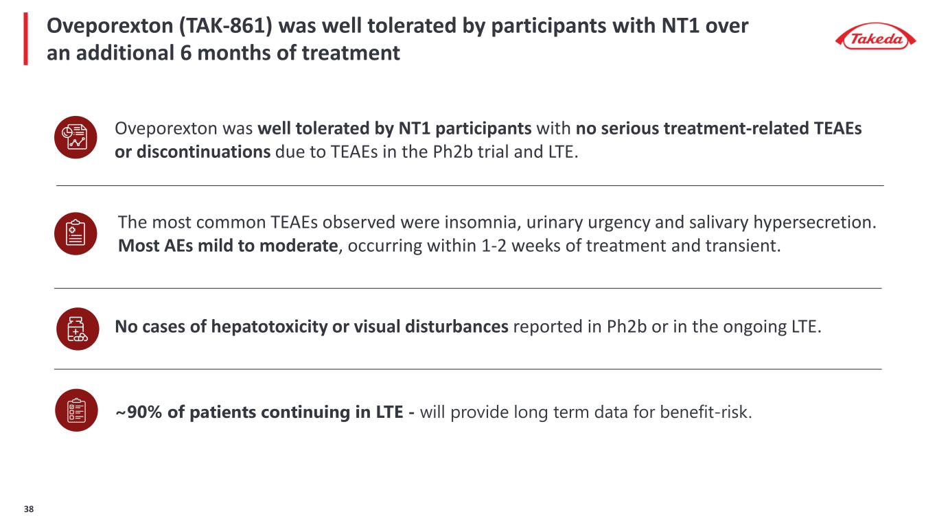 Oveporexton was well tolerated by NT1 participants with no serious treatment-related TEAEs or discontinuations due to TEAEs in the Ph2b trial and LTE. ~90% of patients continuing in LTE - will provide long term data for benefit-risk. The most common TEAEs observed were insomnia, urinary urgency and salivary hypersecretion. Most AEs mild to moderate, occurring within 1-2 weeks of treatment and transient. No cases of hepatotoxicity or visual disturbances reported in Ph2b or in the ongoing LTE. Oveporexton (TAK-861) was well tolerated by participants with NT1 over an additional 6 months of treatment 38
