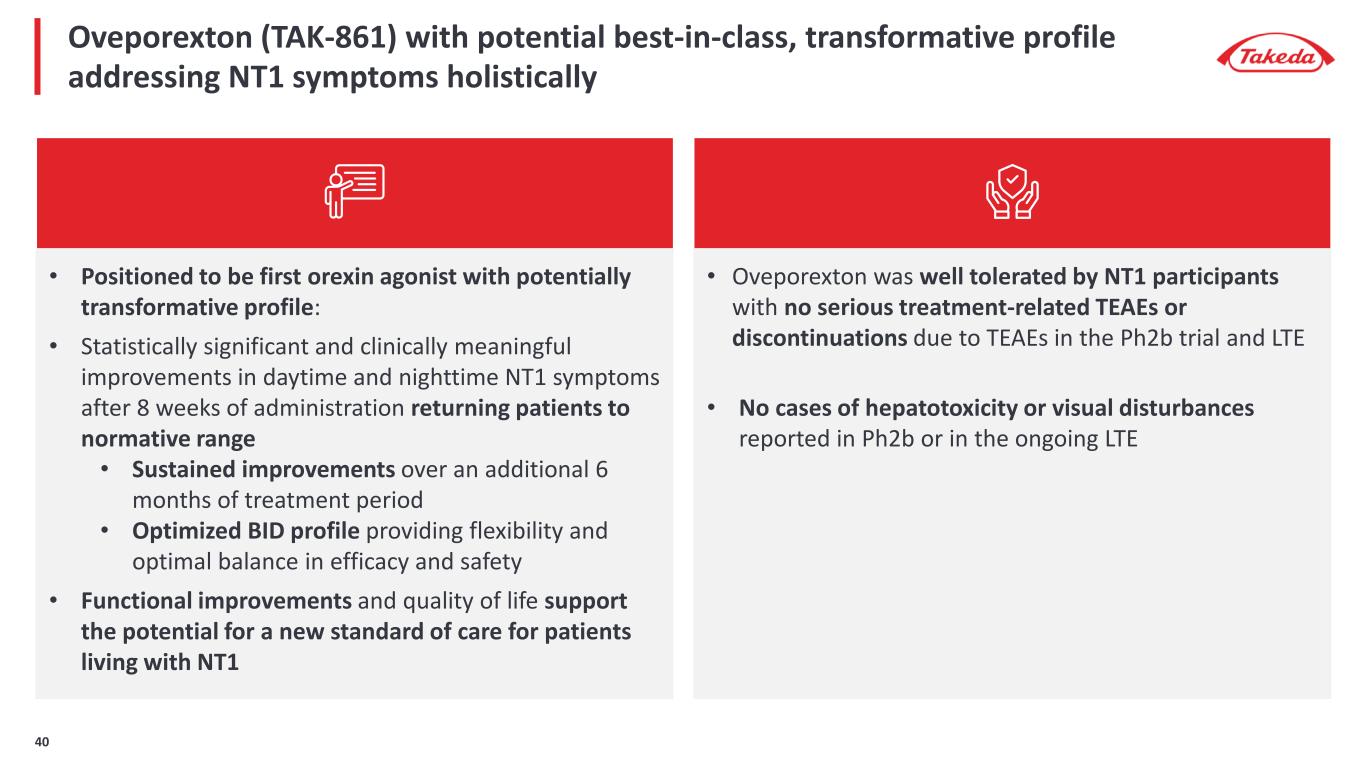 • Positioned to be first orexin agonist with potentially transformative profile: • Statistically significant and clinically meaningful improvements in daytime and nighttime NT1 symptoms after 8 weeks of administration returning patients to normative range • Sustained improvements over an additional 6 months of treatment period • Optimized BID profile providing flexibility and optimal balance in efficacy and safety • Functional improvements and quality of life support the potential for a new standard of care for patients living with NT1 • Oveporexton was well tolerated by NT1 participants with no serious treatment-related TEAEs or discontinuations due to TEAEs in the Ph2b trial and LTE • No cases of hepatotoxicity or visual disturbances reported in Ph2b or in the ongoing LTE Oveporexton (TAK-861) with potential best-in-class, transformative profile addressing NT1 symptoms holistically 40