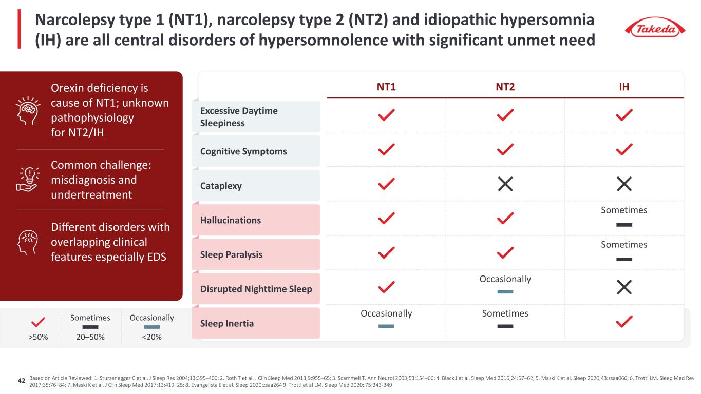Based on Article Reviewed: 1. Sturzenegger C et al. J Sleep Res 2004;13:395–406; 2. Roth T et al. J Clin Sleep Med 2013;9:955–65; 3. Scammell T. Ann Neurol 2003;53:154–66; 4. Black J et al. Sleep Med 2016;24:57–62; 5. Maski K et al. Sleep 2020;43:zsaa066; 6. Trotti LM. Sleep Med Rev 2017;35:76–84; 7. Maski K et al. J Clin Sleep Med 2017;13:419–25; 8. Evangelista E et al. Sleep 2020;zsaa264 9. Trotti et al LM. Sleep Med 2020: 75:343-349 NT1 NT2 IH Sometimes Sometimes Occasionally Occasionally Sometimes Excessive Daytime Sleepiness Cognitive Symptoms Cataplexy Hallucinations Sleep Paralysis Disrupted Nighttime Sleep Sleep Inertia Orexin deficiency is cause of NT1; unknown pathophysiology for NT2/IH Common challenge: misdiagnosis and undertreatment Different disorders with overlapping clinical features especially EDS >50% Sometimes 20–50% Occasionally <20% Narcolepsy type 1 (NT1), narcolepsy type 2 (NT2) and idiopathic hypersomnia (IH) are all central disorders of hypersomnolence with significant unmet need 42