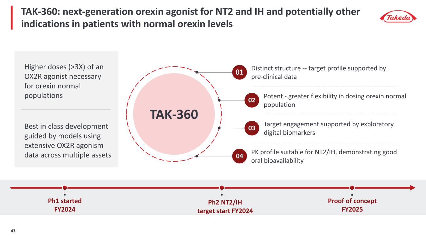 Higher doses (>3X) of an OX2R agonist necessary for orexin normal populations Best in class development guided by models using extensive OX2R agonism data across multiple assets TAK-360 Distinct structure -- target profile supported by pre-clinical data01 02 Potent - greater flexibility in dosing orexin normal population 03 Target engagement supported by exploratory digital biomarkers PK profile suitable for NT2/IH, demonstrating good oral bioavailability 04 Ph1 started FY2024 Ph2 NT2/IH target start FY2024 Proof of concept FY2025 TAK-360: next-generation orexin agonist for NT2 and IH and potentially other indications in patients with normal orexin levels 43