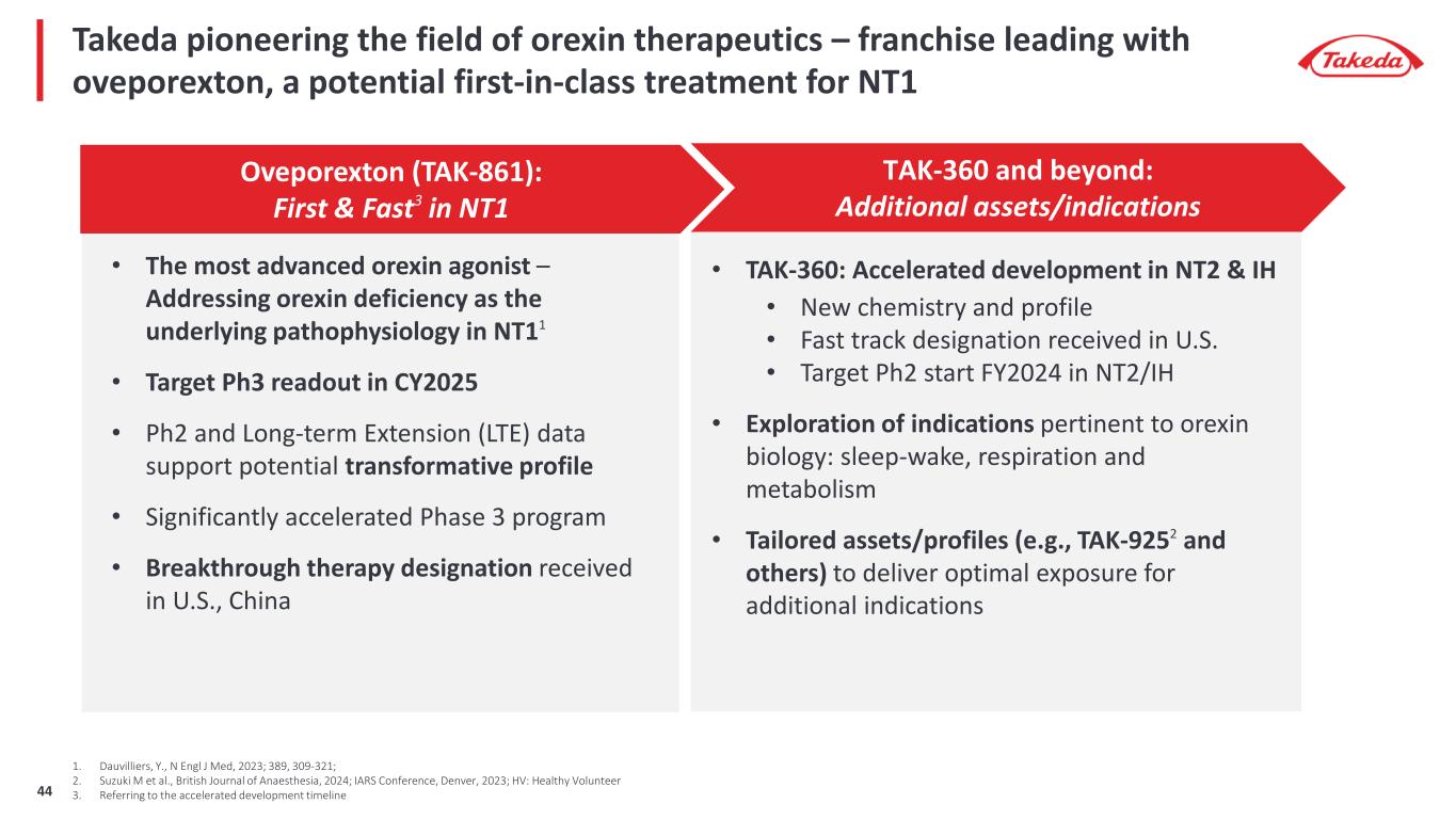 • TAK-360: Accelerated development in NT2 & IH • New chemistry and profile • Fast track designation received in U.S. • Target Ph2 start FY2024 in NT2/IH • Exploration of indications pertinent to orexin biology: sleep-wake, respiration and metabolism • Tailored assets/profiles (e.g., TAK-9252 and others) to deliver optimal exposure for additional indications Takeda pioneering the field of orexin therapeutics – franchise leading with oveporexton, a potential first-in-class treatment for NT1 1. Dauvilliers, Y., N Engl J Med, 2023; 389, 309-321; 2. Suzuki M et al., British Journal of Anaesthesia, 2024; IARS Conference, Denver, 2023; HV: Healthy Volunteer 3. Referring to the accelerated development timeline Oveporexton (TAK-861): First & Fast3 in NT1 TAK-360 and beyond: Additional assets/indications • The most advanced orexin agonist – Addressing orexin deficiency as the underlying pathophysiology in NT11 • Target Ph3 readout in CY2025 • Ph2 and Long-term Extension (LTE) data support potential transformative profile • Significantly accelerated Phase 3 program • Breakthrough therapy designation received in U.S., China 44