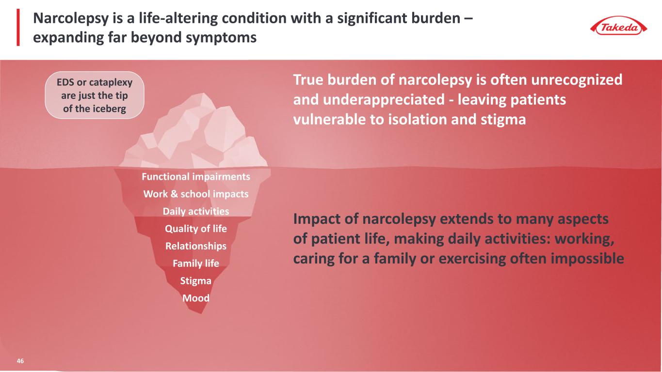 EDS or cataplexy are just the tip of the iceberg Functional impairments Work & school impacts Daily activities Quality of life Relationships Family life Stigma Mood True burden of narcolepsy is often unrecognized and underappreciated - leaving patients vulnerable to isolation and stigma Impact of narcolepsy extends to many aspects of patient life, making daily activities: working, caring for a family or exercising often impossible Narcolepsy is a life-altering condition with a significant burden – expanding far beyond symptoms 46