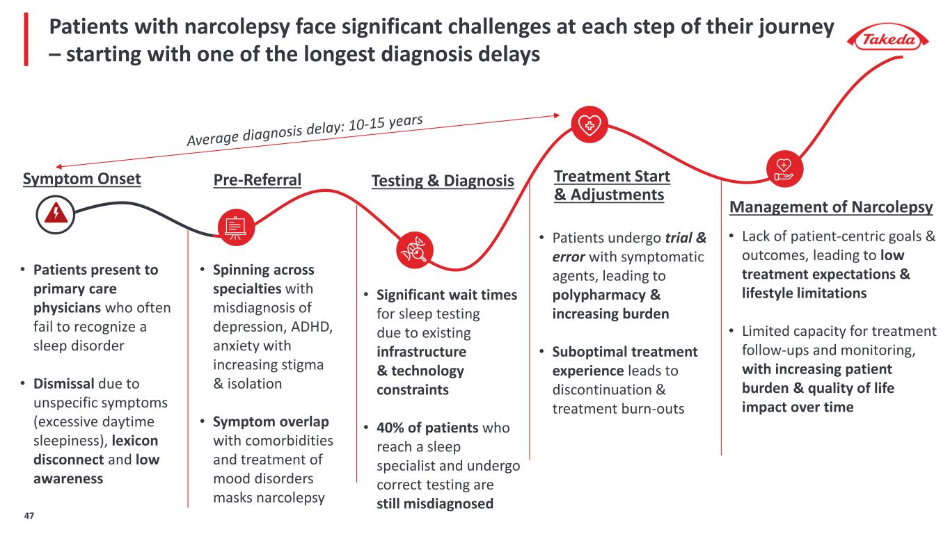 Testing & DiagnosisPre-Referral Treatment Start & Adjustments Patients with narcolepsy face significant challenges at each step of their journey – starting with one of the longest diagnosis delays Symptom Onset • Spinning across specialties with misdiagnosis of depression, ADHD, anxiety with increasing stigma & isolation • Symptom overlap with comorbidities and treatment of mood disorders masks narcolepsy • Patients present to primary care physicians who often fail to recognize a sleep disorder • Dismissal due to unspecific symptoms (excessive daytime sleepiness), lexicon disconnect and low awareness • Significant wait times for sleep testing due to existing infrastructure & technology constraints • 40% of patients who reach a sleep specialist and undergo correct testing are still misdiagnosed • Patients undergo trial & error with symptomatic agents, leading to polypharmacy & increasing burden • Suboptimal treatment experience leads to discontinuation & treatment burn-outs Management of Narcolepsy • Lack of patient-centric goals & outcomes, leading to low treatment expectations & lifestyle limitations • Limited capacity for treatment follow-ups and monitoring, with increasing patient burden & quality of life impact over time 47