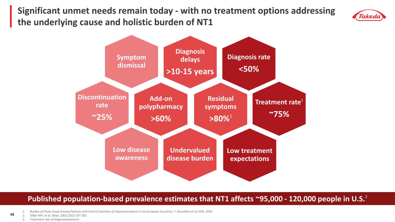 Symptom dismissal Diagnosis delays >10-15 years Discontinuation rate ~25% Add-on polypharmacy >60% Low disease awareness Undervalued disease burden Residual symptoms >80%1 Diagnosis rate <50% Low treatment expectations Treatment rate3 ~75% Significant unmet needs remain today - with no treatment options addressing the underlying cause and holistic burden of NT1 Published population-based prevalence estimates that NT1 affects ~95,000 - 120,000 people in U.S.2 1. Burden of Illness Study Among Patients with Central Disorders of Hypersomnolence in Six European Countries, Y. Dauvilliers et al, EAN, 2024 2. Silber MH, et al. Sleep. 2002;25(2):197-202 3. Treatment rate of diagnosed patients 48