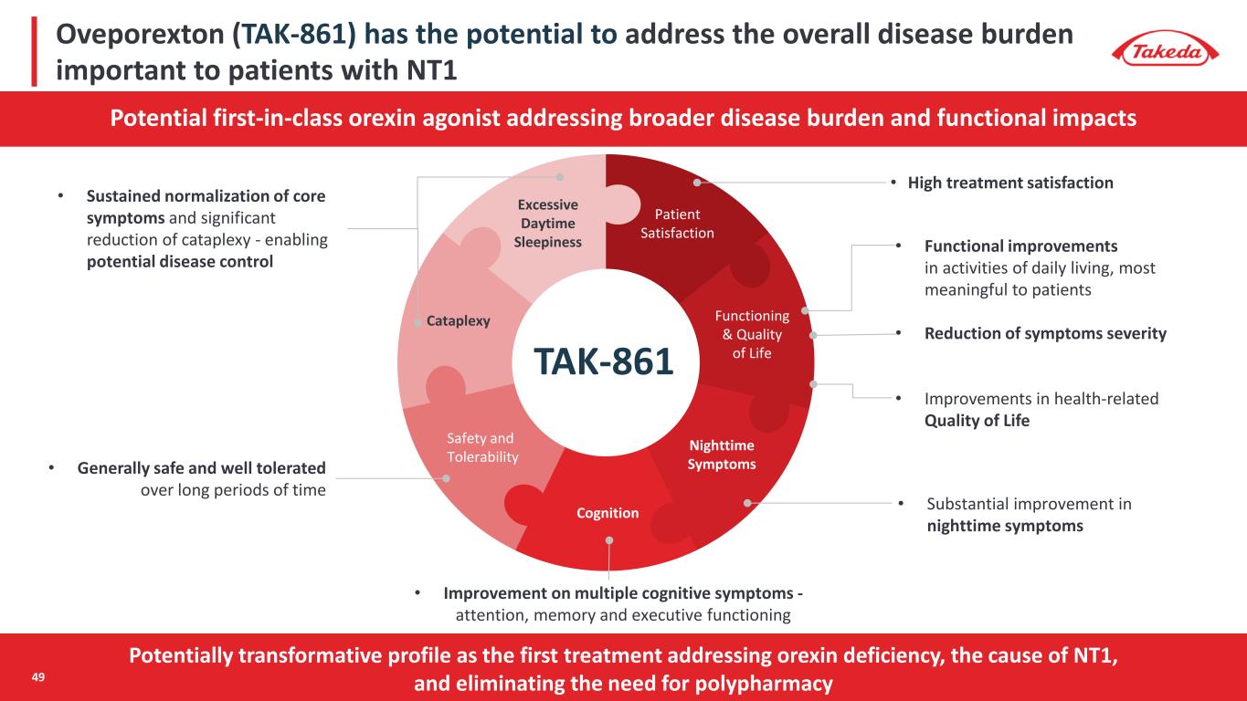 Potentially transformative profile as the first treatment addressing orexin deficiency, the cause of NT1, and eliminating the need for polypharmacy TAK-861 Patient Satisfaction Cataplexy Safety and Tolerability Functioning & Quality of Life Nighttime Symptoms Cognition Excessive Daytime Sleepiness • Sustained normalization of core symptoms and significant reduction of cataplexy - enabling potential disease control • Generally safe and well tolerated over long periods of time • High treatment satisfaction • Functional improvements in activities of daily living, most meaningful to patients • Reduction of symptoms severity • Improvements in health-related Quality of Life • Improvement on multiple cognitive symptoms - attention, memory and executive functioning • Substantial improvement in nighttime symptoms Potential first-in-class orexin agonist addressing broader disease burden and functional impacts Oveporexton (TAK-861) has the potential to address the overall disease burden important to patients with NT1 49