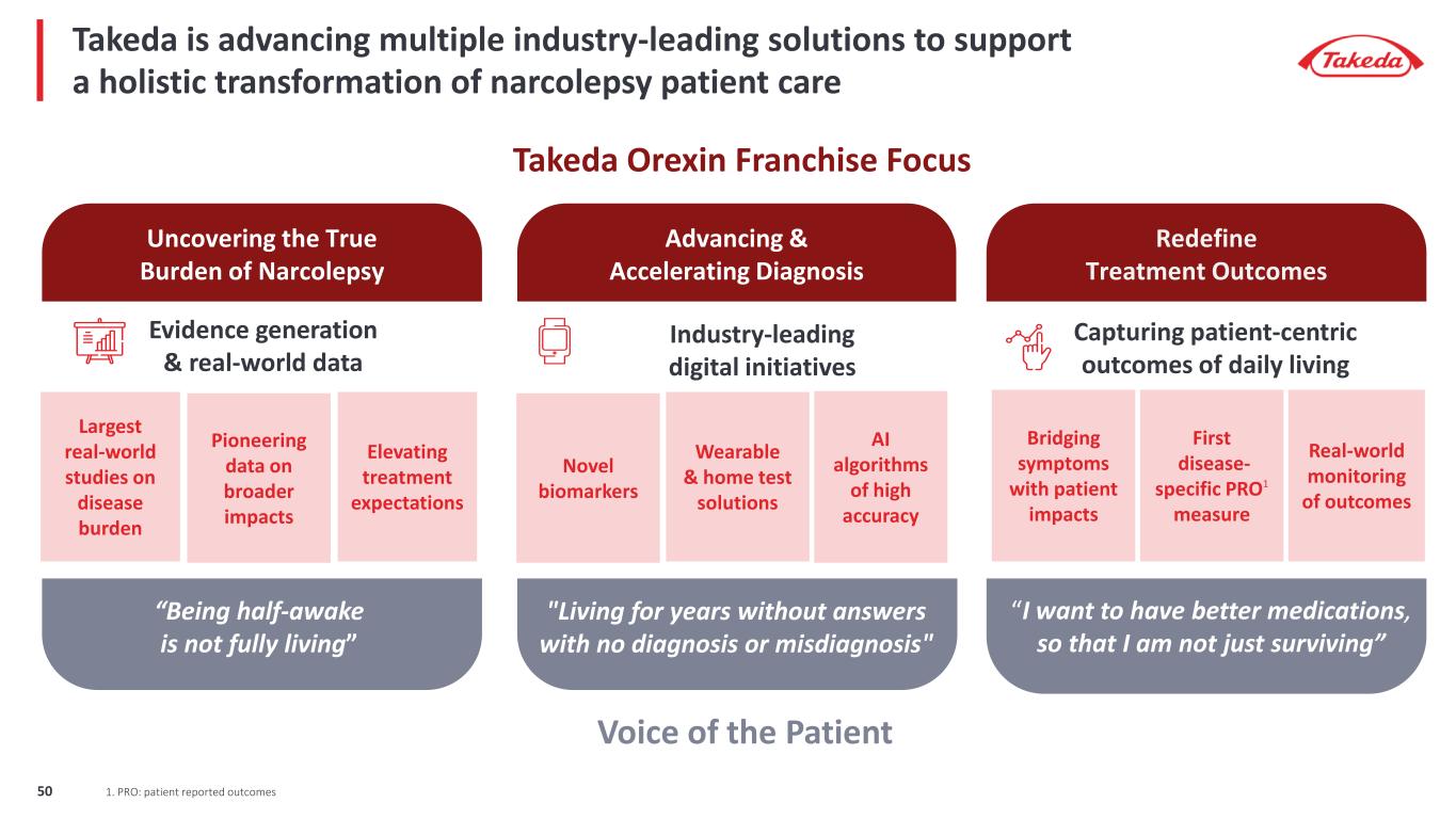 Takeda Orexin Franchise Focus Voice of the Patient Capturing patient-centric outcomes of daily living Industry-leading digital initiatives Evidence generation & real-world data Uncovering the True Burden of Narcolepsy Advancing & Accelerating Diagnosis Redefine Treatment Outcomes “Being half-awake is not fully living” "Living for years without answers with no diagnosis or misdiagnosis" “I want to have better medications, so that I am not just surviving” Largest real-world studies on disease burden Pioneering data on broader impacts Elevating treatment expectations Novel biomarkers Wearable & home test solutions AI algorithms of high accuracy Bridging symptoms with patient impacts First disease- specific PRO1 measure Real-world monitoring of outcomes Takeda is advancing multiple industry-leading solutions to support a holistic transformation of narcolepsy patient care 1. PRO: patient reported outcomes50