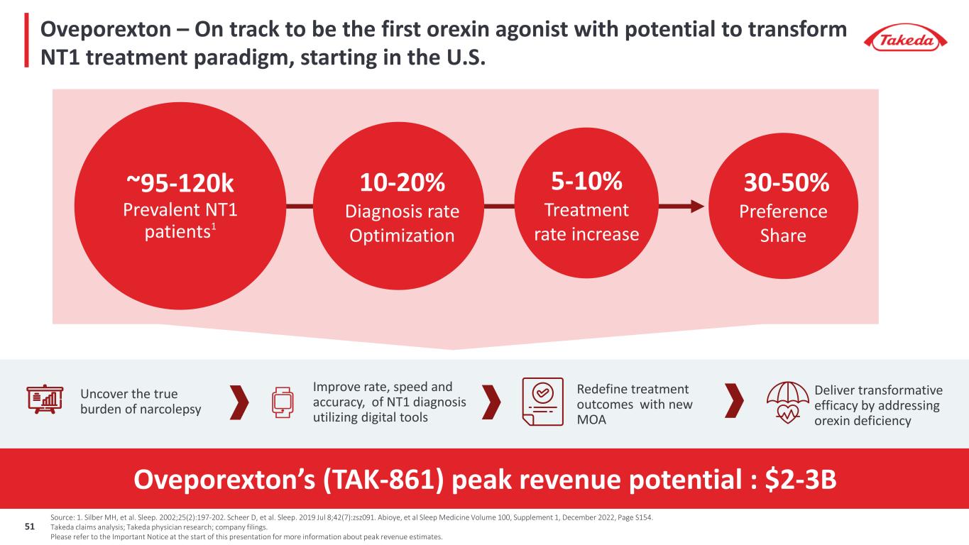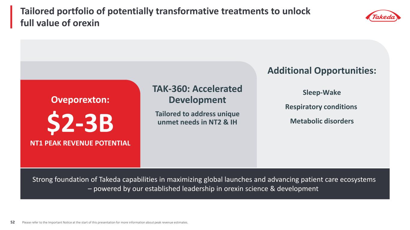 Oveporexton – On track to be the first orexin agonist with potential to transform NT1 treatment paradigm, starting in the U.S. Redefine treatment outcomes with new MOA Improve rate, speed and accuracy, of NT1 diagnosis utilizing digital tools Uncover the true burden of narcolepsy Deliver transformative efficacy by addressing orexin deficiency Source: 1. Silber MH, et al. Sleep. 2002;25(2):197-202. Scheer D, et al. Sleep. 2019 Jul 8;42(7):zsz091. Abioye, et al Sleep Medicine Volume 100, Supplement 1, December 2022, Page S154. Takeda claims analysis; Takeda physician research; company filings. Please refer to the Important Notice at the start of this presentation for more information about peak revenue estimates. Oveporexton’s (TAK-861) peak revenue potential : $2-3B ~95-120k Prevalent NT1 patients1 30-50% Preference Share 10-20% Diagnosis rate Optimization 5-10% Treatment rate increase 51