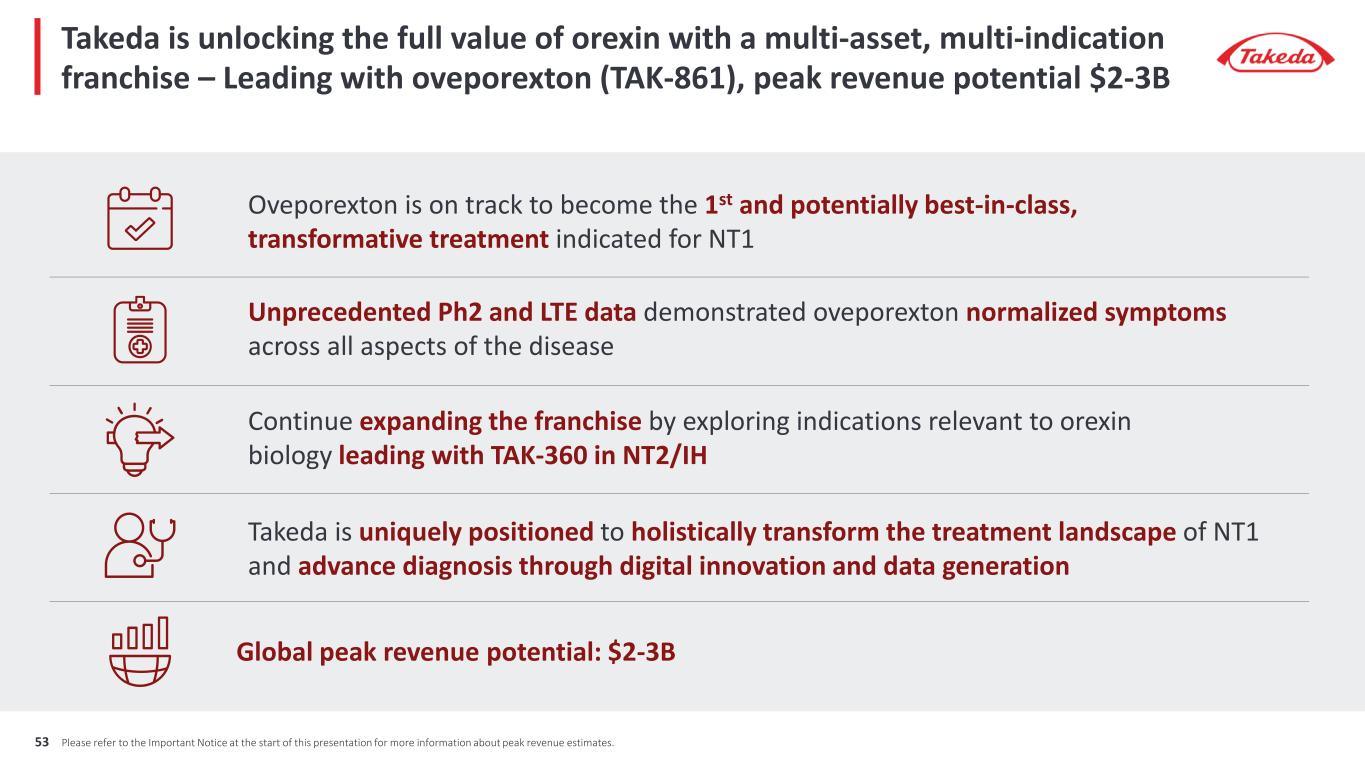 Tailored portfolio of potentially transformative treatments to unlock full value of orexin Oveporexton: $2-3B NT1 PEAK REVENUE POTENTIAL TAK-360: Accelerated Development Tailored to address unique unmet needs in NT2 & IH Strong foundation of Takeda capabilities in maximizing global launches and advancing patient care ecosystems – powered by our established leadership in orexin science & development Additional Opportunities: Sleep-Wake Respiratory conditions Metabolic disorders Please refer to the Important Notice at the start of this presentation for more information about peak revenue estimates.52