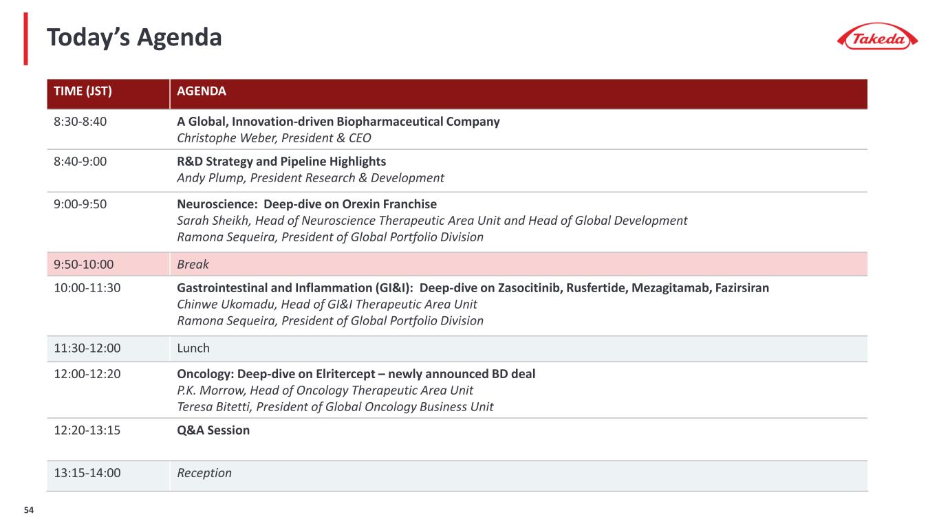 Today’s Agenda TIME (JST) AGENDA 8:30-8:40 A Global, Innovation-driven Biopharmaceutical Company Christophe Weber, President & CEO 8:40-9:00 R&D Strategy and Pipeline Highlights Andy Plump, President Research & Development 9:00-9:50 Neuroscience: Deep-dive on Orexin Franchise Sarah Sheikh, Head of Neuroscience Therapeutic Area Unit and Head of Global Development Ramona Sequeira, President of Global Portfolio Division 9:50-10:00 Break 10:00-11:30 Gastrointestinal and Inflammation (GI&I): Deep-dive on Zasocitinib, Rusfertide, Mezagitamab, Fazirsiran Chinwe Ukomadu, Head of GI&I Therapeutic Area Unit Ramona Sequeira, President of Global Portfolio Division 11:30-12:00 Lunch 12:00-12:20 Oncology: Deep-dive on Elritercept – newly announced BD deal P.K. Morrow, Head of Oncology Therapeutic Area Unit Teresa Bitetti, President of Global Oncology Business Unit 12:20-13:15 Q&A Session 13:15-14:00 Reception 54