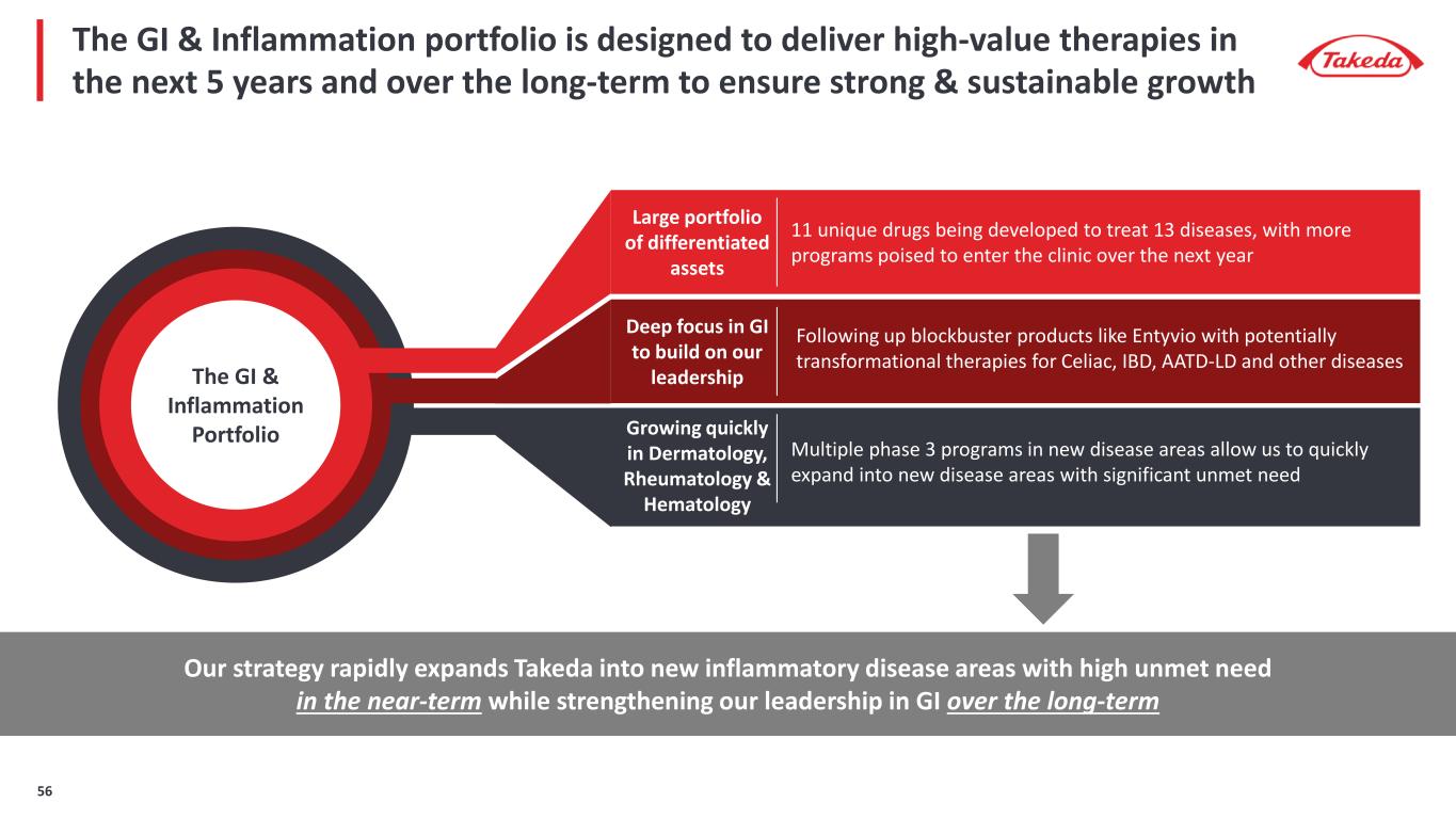 The GI & Inflammation portfolio is designed to deliver high-value therapies in the next 5 years and over the long-term to ensure strong & sustainable growth 11 unique drugs being developed to treat 13 diseases, with more programs poised to enter the clinic over the next year Large portfolio of differentiated assets Following up blockbuster products like Entyvio with potentially transformational therapies for Celiac, IBD, AATD-LD and other diseases Deep focus in GI to build on our leadership Multiple phase 3 programs in new disease areas allow us to quickly expand into new disease areas with significant unmet need Growing quickly in Dermatology, Rheumatology & Hematology The GI & Inflammation Portfolio Our strategy rapidly expands Takeda into new inflammatory disease areas with high unmet need in the near-term while strengthening our leadership in GI over the long-term 56