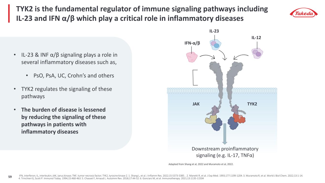 TYK2 is the fundamental regulator of immune signaling pathways including IL-23 and IFN α/β which play a critical role in inflammatory diseases JAK TYK2 IL-23 Downstream proinflammatory signaling (e.g. IL-17, TNFα) IFN-α/β IL-12 Adapted from Shang et al, 2022 and Muramoto et al, 2022. IFN, interferon; IL, interleukin; JAK, Janus kinase; TNF, tumor necrosis factor; TYK2, tyrosine kinase 2. 1. Shang L, et al. J Inflamm Res. 2022;15:5373-5385. . 2. Manetti R, et al. J Exp Med. 1993;177:1199-1204. 3. Muramoto R, et al. World J Biol Chem. 2022;13:1-14. 4. Trinchieri G, Scott P. Immunol Today. 1994;15:460-463. 5. Chasset F, Arnaud L. Autoimm Rev. 2018;17:44-52. 6. Gonciarz M, et al. Immunotherapy. 2021;13:1135-11504 • IL-23 & INF α/β signaling plays a role in several inflammatory diseases such as, • PsO, PsA, UC, Crohn’s and others • TYK2 regulates the signaling of these pathways • The burden of disease is lessened by reducing the signaling of these pathways in patients with inflammatory diseases 59