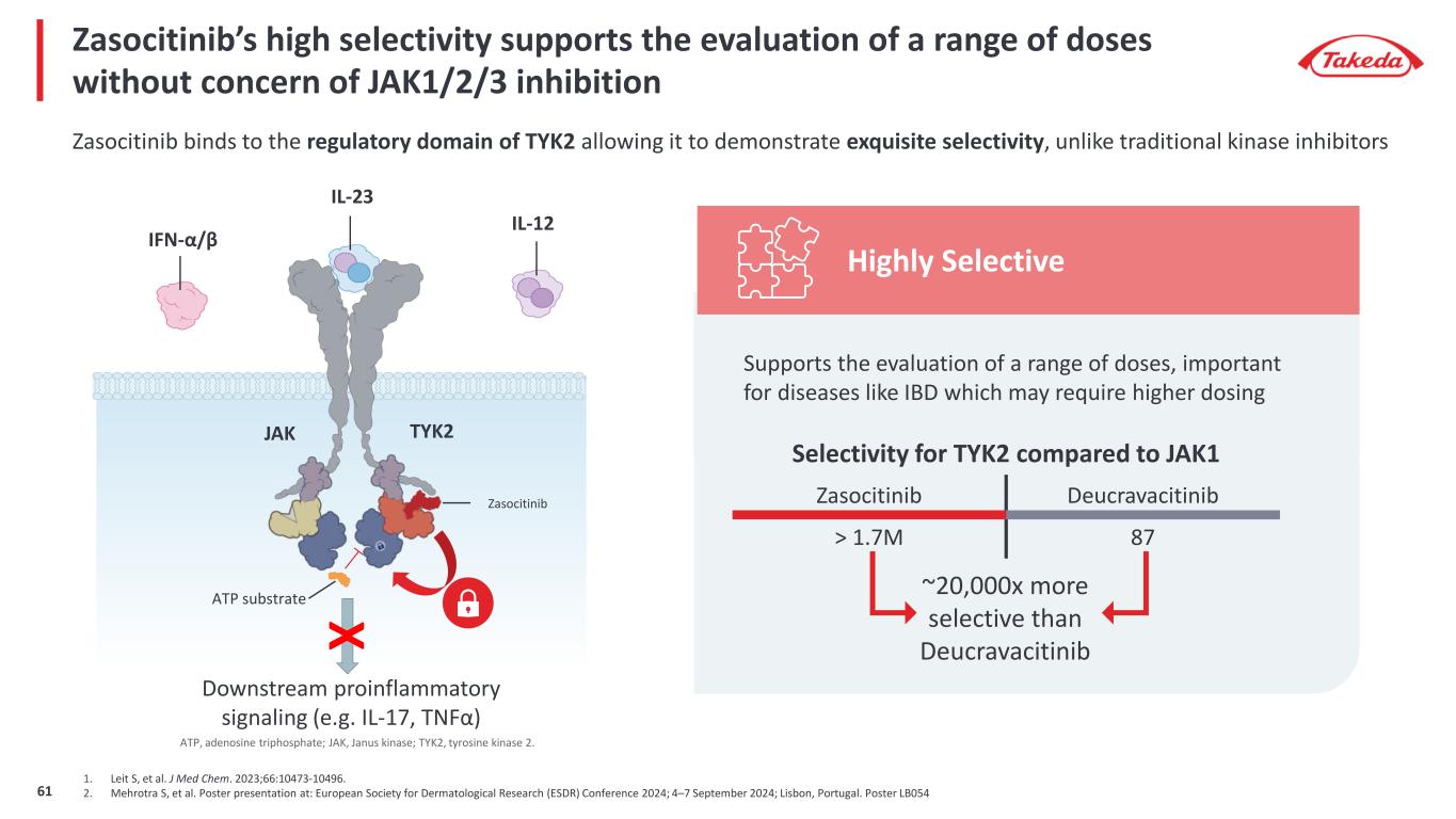 Zasocitinib’s high selectivity supports the evaluation of a range of doses without concern of JAK1/2/3 inhibition 1. Leit S, et al. J Med Chem. 2023;66:10473-10496. 2. Mehrotra S, et al. Poster presentation at: European Society for Dermatological Research (ESDR) Conference 2024; 4–7 September 2024; Lisbon, Portugal. Poster LB054 Zasocitinib binds to the regulatory domain of TYK2 allowing it to demonstrate exquisite selectivity, unlike traditional kinase inhibitors JAK TYK2 IL-23 Downstream proinflammatory signaling (e.g. IL-17, TNFα) IFN-α/β IL-12 ATP substrate Zasocitinib X Selectivity for TYK2 compared to JAK1 Zasocitinib Deucravacitinib > 1.7M 87 ~20,000x more selective than Deucravacitinib Supports the evaluation of a range of doses, important for diseases like IBD which may require higher dosing Highly Selective ATP, adenosine triphosphate; JAK, Janus kinase; TYK2, tyrosine kinase 2. 61