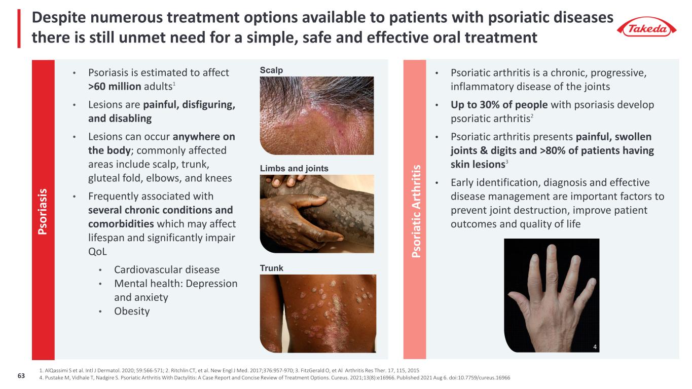 Despite numerous treatment options available to patients with psoriatic diseases there is still unmet need for a simple, safe and effective oral treatment • Psoriasis is estimated to affect >60 million adults1 • Lesions are painful, disfiguring, and disabling • Lesions can occur anywhere on the body; commonly affected areas include scalp, trunk, gluteal fold, elbows, and knees • Frequently associated with several chronic conditions and comorbidities which may affect lifespan and significantly impair QoL • Cardiovascular disease​ • Mental health: Depression and anxiety ​ • Obesity Ps or ia si s • Psoriatic arthritis is a chronic, progressive, inflammatory disease of the joints • Up to 30% of people with psoriasis develop psoriatic arthritis2 • Psoriatic arthritis presents painful, swollen joints & digits and >80% of patients having skin lesions3 • Early identification, diagnosis and effective disease management are important factors to prevent joint destruction, improve patient outcomes and quality of life Ps or ia tic A rt hr iti s Scalp Trunk Limbs and joints 1. AlQassimi S et al. Intl J Dermatol. 2020; 59:566-571; 2. Ritchlin CT, et al. New Engl J Med. 2017;376:957-970; 3. FitzGerald O, et Al Arthritis Res Ther. 17, 115, 2015 4. Pustake M, Vidhale T, Nadgire S. Psoriatic Arthritis With Dactylitis: A Case Report and Concise Review of Treatment Options. Cureus. 2021;13(8):e16966. Published 2021 Aug 6. doi:10.7759/cureus.16966 4 63