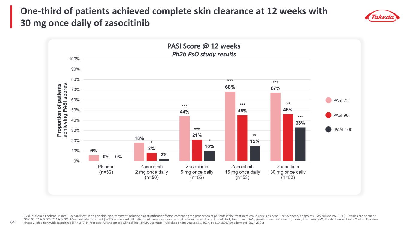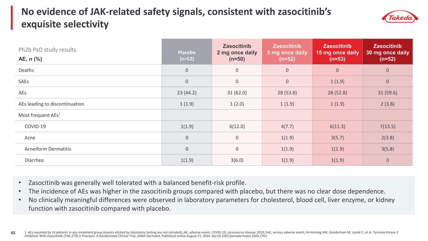 One-third of patients achieved complete skin clearance at 12 weeks with 30 mg once daily of zasocitinib PASI 100 PASI 90 PASI 75 6% 18% *** 44% *** 68% *** 67% 0% * 8% *** 21% *** 45% *** 46% 0% 2% * 10% ** 15% *** 33% 0% 10% 20% 30% 40% 50% 60% 70% 80% 90% 100% Placebo (n=52) Zasocitinib 2 mg once daily (n=50) Zasocitinib 5 mg once daily (n=52) Zasocitinib 15 mg once daily (n=53) Zasocitinib 30 mg once daily (n=52) Pr op or tio n of p at ie nt s ac hi ev in g PA SI s co re s PASI Score @ 12 weeks Ph2b PsO study results P values from a Cochran-Mantel-Haenszel test, with prior biologic treatment included as a stratification factor, comparing the proportion of patients in the treatment group versus placebo. For secondary endpoints (PASI 90 and PASI 100), P values are nominal: *P<0.05; **P<0.005; ***P<0.001. Modified intent-to-treat (mITT) analysis set: all patients who were randomized and received at least one dose of study treatment.; PASI, psoriasis area and severity index.; Armstrong AW, Gooderham M, Lynde C, et al. Tyrosine Kinase 2 Inhibition With Zasocitinib (TAK-279) in Psoriasis: A Randomized Clinical Trial. JAMA Dermatol. Published online August 21, 2024. doi:10.1001/jamadermatol.2024.2701;64