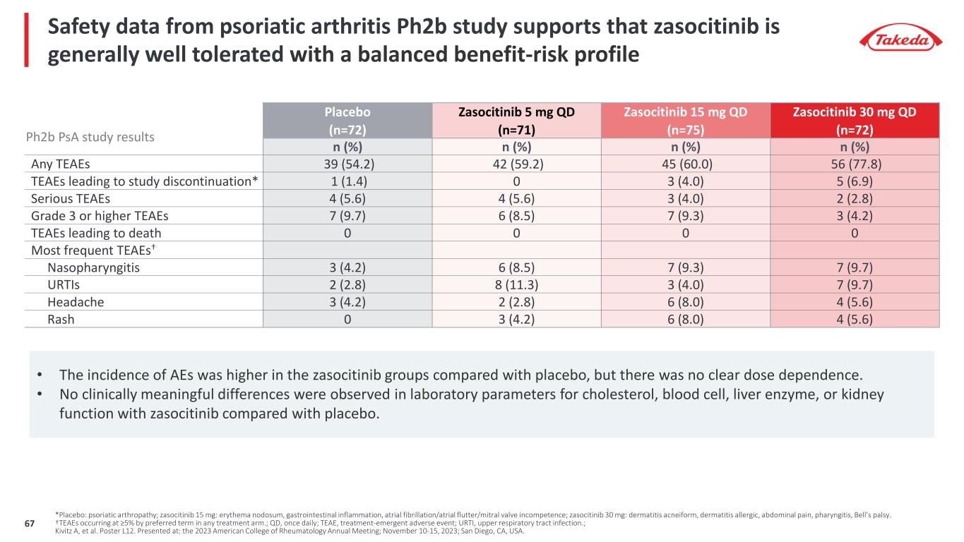 Strong efficacy across joint and skin endpoints demonstrated in Ph2b PsA study ACR 20, ACR 50, ACR 70 Response at Week 121 Ph2b Study Results PASI 75 Response at Week 121 Ph2b Study Results 15.4% 25.6% 28.3% * 45.7% 0 20 40 60 80 100 Re sp on se ra te , % (9 5% C I) Placebo (n=39) TAK-279 5mg QD (N=39) TAK-279 15mg QD (N=46) TAK-279 30mg QD (N=46) 12.5% 18.3% * 28% * 29.2% 0 20 40 60 80 100 Re sp on se ra te , % (9 5% C I) Placebo (n=72) TAK-279 5mg QD (N=71) TAK-279 15mg QD (N=75) TAK-279 30mg QD (N=72) MDA for Psoriatic Arthritis at Week 121 Ph2b Study Results 29% 35% * 53% * 54% 10% 16% * 27% * 26% 6% 9% 15% 14% 0% 10% 20% 30% 40% 50% 60% 70% 80% 90% 100% Placebo (n=72) Zasocitinib 5 mg once daily (n=71) Zasocitinib 15 mg once daily (n=75) Zasocitinib 30 mg once daily (n=72) R es po ns e R at e (% ) ACR 70ACR 50ACR 20 * p<0.005, vs placebo; p values for secondary endpoints (ACR 50, ACR 70, MDA, PASI 75) are nominal. ; ACR, American College of Rheumatology; CI, confidence interval; MDA, minimal disease activity; QD, once daily. 1. Kivitz A, et al. Poster L12. Presented at: the 2023 American College of Rheumatology Annual Meeting; November 10-15, 2023; San Diego, CA,, USA. 66