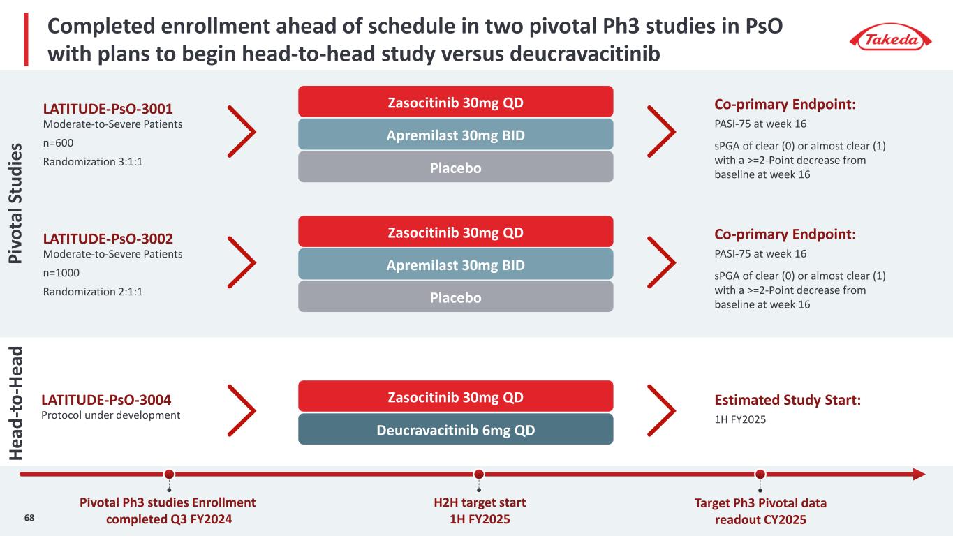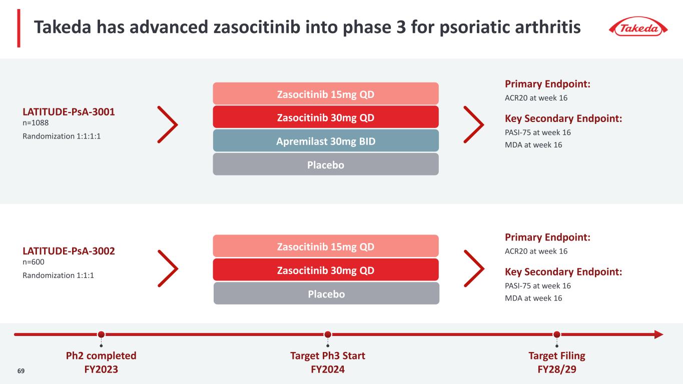Takeda has advanced zasocitinib into phase 3 for psoriatic arthritis LATITUDE-PsA-3001 n=1088 Randomization 1:1:1:1 Primary Endpoint: ACR20 at week 16 Key Secondary Endpoint: PASI-75 at week 16 MDA at week 16 Zasocitinib 15mg QD Placebo Zasocitinib 30mg QD Apremilast 30mg BID LATITUDE-PsA-3002 n=600 Randomization 1:1:1 Primary Endpoint: ACR20 at week 16 Key Secondary Endpoint: PASI-75 at week 16 MDA at week 16 Zasocitinib 15mg QD Placebo Zasocitinib 30mg QD Ph2 completed FY2023 Target Ph3 Start FY2024 Target Filing FY28/2969