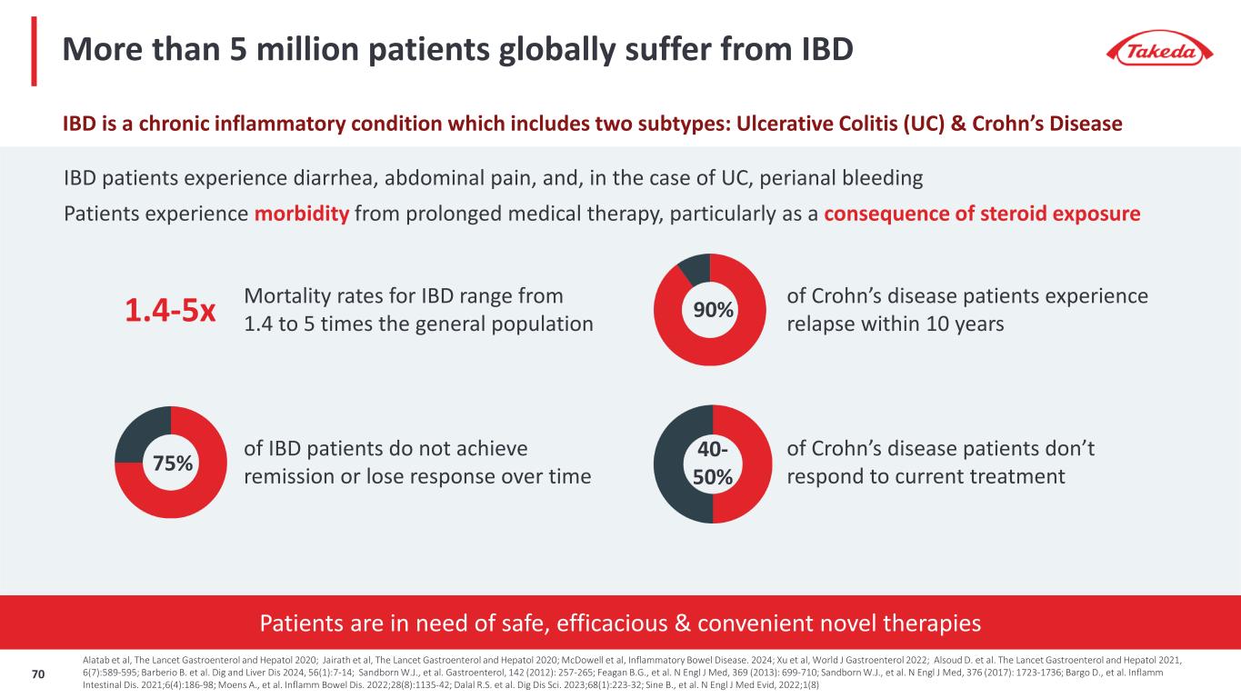 Patients are in need of safe, efficacious & convenient novel therapies More than 5 million patients globally suffer from IBD Mortality rates for IBD range from 1.4 to 5 times the general population 1.4-5x 90% of Crohn’s disease patients experience relapse within 10 years 75% of IBD patients do not achieve remission or lose response over time 40- 50% of Crohn’s disease patients don’t respond to current treatment IBD patients experience diarrhea, abdominal pain, and, in the case of UC, perianal bleeding Patients experience morbidity from prolonged medical therapy, particularly as a consequence of steroid exposure IBD is a chronic inflammatory condition which includes two subtypes: Ulcerative Colitis (UC) & Crohn’s Disease Alatab et al, The Lancet Gastroenterol and Hepatol 2020; Jairath et al, The Lancet Gastroenterol and Hepatol 2020; McDowell et al, Inflammatory Bowel Disease. 2024; Xu et al, World J Gastroenterol 2022; Alsoud D. et al. The Lancet Gastroenterol and Hepatol 2021, 6(7):589-595; Barberio B. et al. Dig and Liver Dis 2024, 56(1):7-14; Sandborn W.J., et al. Gastroenterol, 142 (2012): 257-265; Feagan B.G., et al. N Engl J Med, 369 (2013): 699-710; Sandborn W.J., et al. N Engl J Med, 376 (2017): 1723-1736; Bargo D., et al. Inflamm Intestinal Dis. 2021;6(4):186-98; Moens A., et al. Inflamm Bowel Dis. 2022;28(8):1135-42; Dalal R.S. et al. Dig Dis Sci. 2023;68(1):223-32; Sine B., et al. N Engl J Med Evid, 2022;1(8) 70