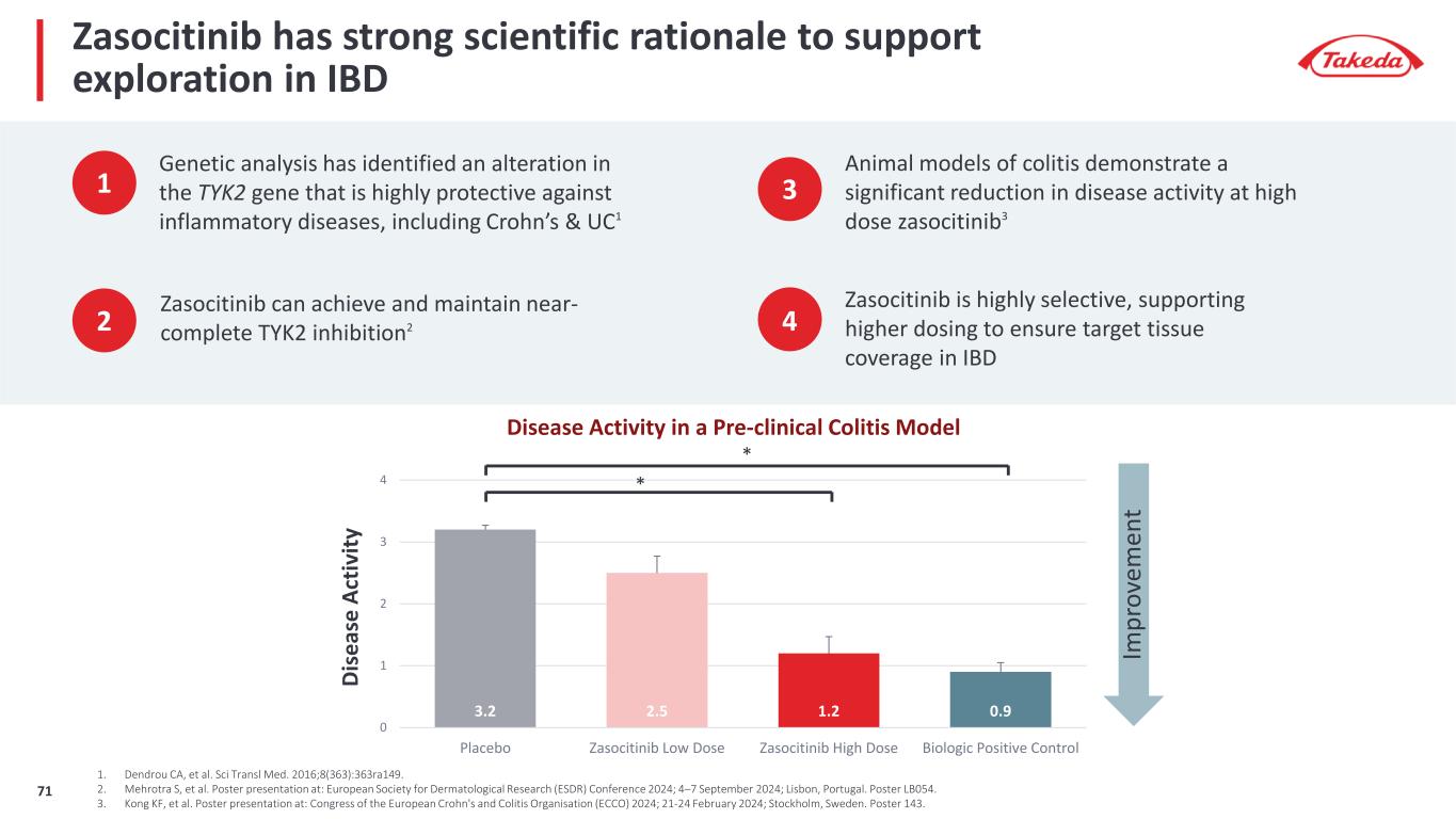 3.2 2.5 1.2 0.9 0 1 2 3 4 Placebo Zasocitinib Low Dose Zasocitinib High Dose Biologic Positive Control Zasocitinib has strong scientific rationale to support exploration in IBD Genetic analysis has identified an alteration in the TYK2 gene that is highly protective against inflammatory diseases, including Crohn’s & UC1 Zasocitinib can achieve and maintain near- complete TYK2 inhibition2 Zasocitinib is highly selective, supporting higher dosing to ensure target tissue coverage in IBD Animal models of colitis demonstrate a significant reduction in disease activity at high dose zasocitinib3 1 2 3 4 Di se as e Ac tiv ity Disease Activity in a Pre-clinical Colitis Model * * Im pr ov em en t 1. Dendrou CA, et al. Sci Transl Med. 2016;8(363):363ra149. 2. Mehrotra S, et al. Poster presentation at: European Society for Dermatological Research (ESDR) Conference 2024; 4–7 September 2024; Lisbon, Portugal. Poster LB054. 3. Kong KF, et al. Poster presentation at: Congress of the European Crohn's and Colitis Organisation (ECCO) 2024; 21-24 February 2024; Stockholm, Sweden. Poster 143. 71