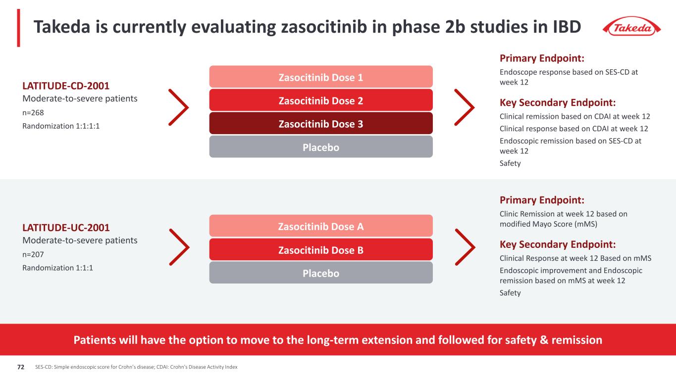 Takeda is currently evaluating zasocitinib in phase 2b studies in IBD LATITUDE-CD-2001 Moderate-to-severe patients n=268 Randomization 1:1:1:1 Primary Endpoint: Endoscope response based on SES-CD at week 12 Key Secondary Endpoint: Clinical remission based on CDAI at week 12 Clinical response based on CDAI at week 12 Endoscopic remission based on SES-CD at week 12 Safety Zasocitinib Dose 1 Placebo Zasocitinib Dose 2 Zasocitinib Dose 3 LATITUDE-UC-2001 Moderate-to-severe patients n=207 Randomization 1:1:1 Primary Endpoint: Clinic Remission at week 12 based on modified Mayo Score (mMS) Key Secondary Endpoint: Clinical Response at week 12 Based on mMS Endoscopic improvement and Endoscopic remission based on mMS at week 12 Safety Zasocitinib Dose A Placebo Zasocitinib Dose B Patients will have the option to move to the long-term extension and followed for safety & remission SES-CD: Simple endoscopic score for Crohn’s disease; CDAI: Crohn's Disease Activity Index72
