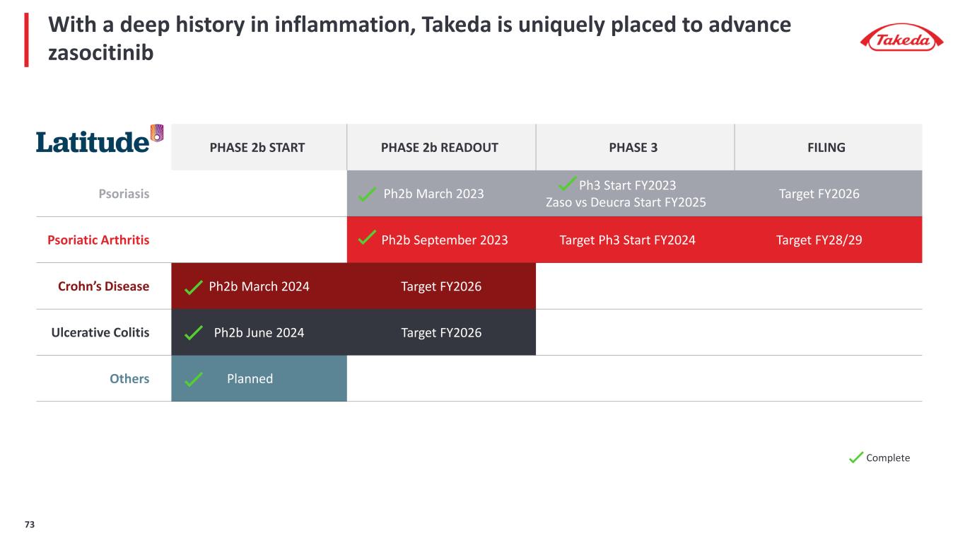 PHASE 2b START PHASE 2b READOUT PHASE 3 FILING Psoriasis Ph2b March 2023 Ph3 Start FY2023 Zaso vs Deucra Start FY2025 Target FY2026 Psoriatic Arthritis Ph2b September 2023 Target Ph3 Start FY2024 Target FY28/29 Crohn’s Disease Ph2b March 2024 Target FY2026 Ulcerative Colitis Ph2b June 2024 Target FY2026 Others Planned With a deep history in inflammation, Takeda is uniquely placed to advance zasocitinib Complete 73