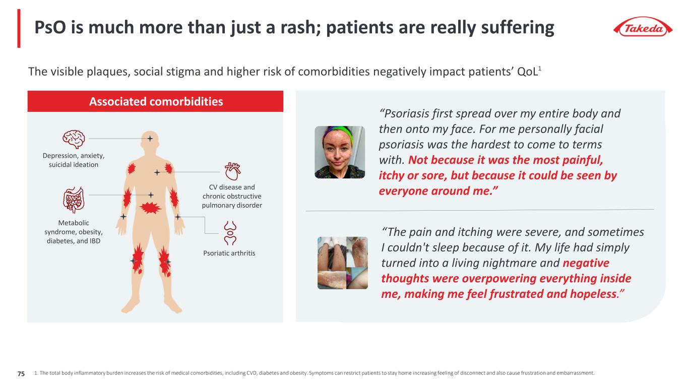 PsO is much more than just a rash; patients are really suffering 1. The total body inflammatory burden increases the risk of medical comorbidities, including CVD, diabetes and obesity. Symptoms can restrict patients to stay home increasing feeling of disconnect and also cause frustration and embarrassment. Associated comorbidities CV disease and chronic obstructive pulmonary disorder Metabolic syndrome, obesity, diabetes, and IBD Depression, anxiety, suicidal ideation Psoriatic arthritis “Psoriasis first spread over my entire body and then onto my face. For me personally facial psoriasis was the hardest to come to terms with. Not because it was the most painful, itchy or sore, but because it could be seen by everyone around me.” “The pain and itching were severe, and sometimes I couldn't sleep because of it. My life had simply turned into a living nightmare and negative thoughts were overpowering everything inside me, making me feel frustrated and hopeless.” The visible plaques, social stigma and higher risk of comorbidities negatively impact patients’ QoL1 75