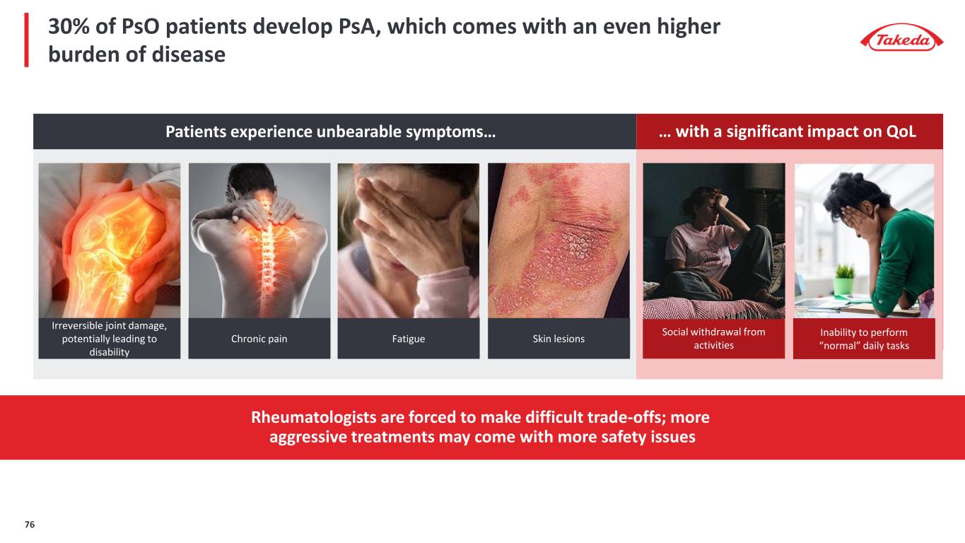 30% of PsO patients develop PsA, which comes with an even higher burden of disease Patients experience unbearable symptoms… … with a significant impact on QoL Social withdrawal from activities Inability to perform “normal” daily tasks Rheumatologists are forced to make difficult trade-offs; more aggressive treatments may come with more safety issues Irreversible joint damage, potentially leading to disability Chronic pain Fatigue Skin lesions 76