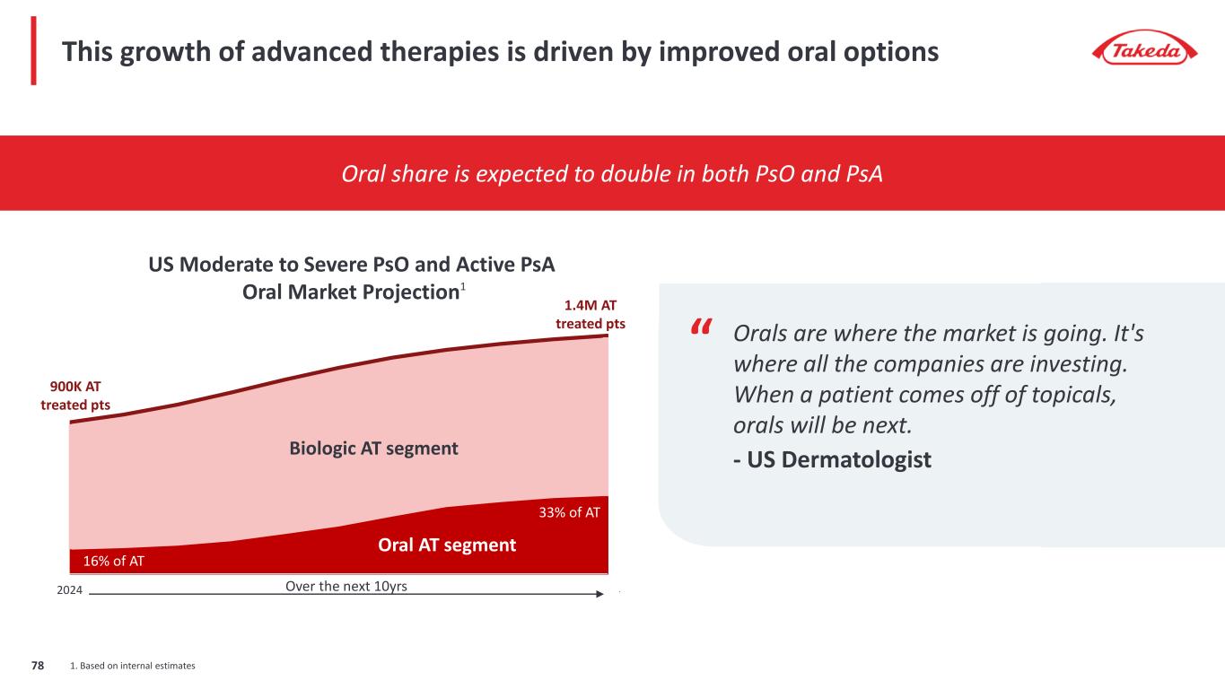 This growth of advanced therapies is driven by improved oral options 2024 2025 2026 2027 2028 2029 2030 2031 2032 2033 2034 900K AT treated pts 33% of AT 16% of AT 1.4M AT treated pts US Moderate to Severe PsO and Active PsA Oral Market Projection1 Biologic AT segment Oral AT segment “ Orals are where the market is going. It's where all the companies are investing. When a patient comes off of topicals, orals will be next. - US Dermatologist Over the next 10yrs Oral share is expected to double in both PsO and PsA 1. Based on internal estimates78