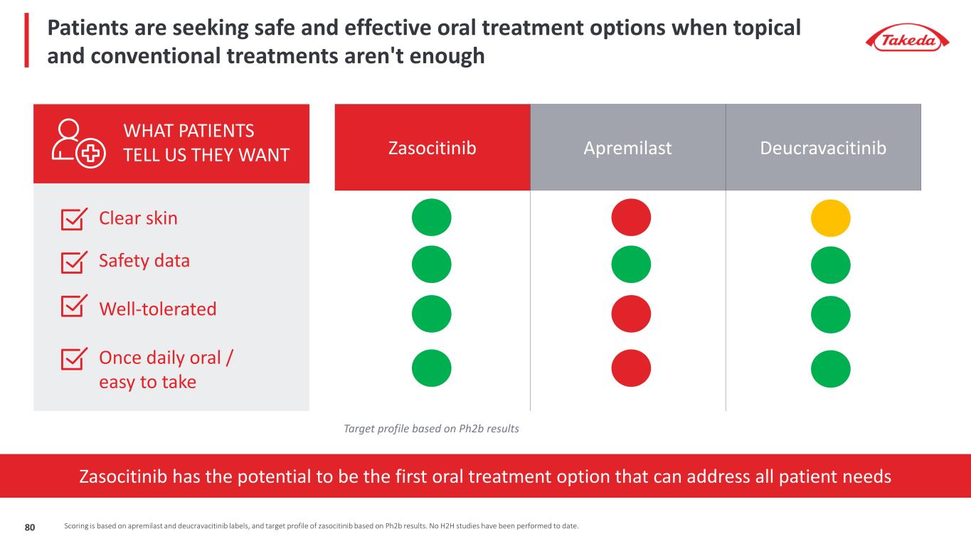Patients are seeking safe and effective oral treatment options when topical and conventional treatments aren't enough Clear skin Safety data Well-tolerated Once daily oral / easy to take WHAT PATIENTS TELL US THEY WANT Zasocitinib has the potential to be the first oral treatment option that can address all patient needs Zasocitinib Apremilast Deucravacitinib Target profile based on Ph2b results Scoring is based on apremilast and deucravacitinib labels, and target profile of zasocitinib based on Ph2b results. No H2H studies have been performed to date.80