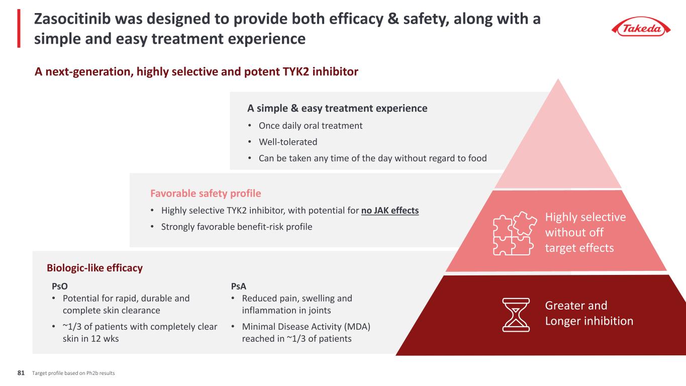 Zasocitinib was designed to provide both efficacy & safety, along with a simple and easy treatment experience A next-generation, highly selective and potent TYK2 inhibitor A simple & easy treatment experience Favorable safety profile Biologic-like efficacy • Once daily oral treatment • Well-tolerated • Can be taken any time of the day without regard to food • Highly selective TYK2 inhibitor, with potential for no JAK effects • Strongly favorable benefit-risk profile PsO • Potential for rapid, durable and complete skin clearance • ~1/3 of patients with completely clear skin in 12 wks PsA • Reduced pain, swelling and inflammation in joints • Minimal Disease Activity (MDA) reached in ~1/3 of patients Greater and Longer inhibition Highly selective without off target effects Target profile based on Ph2b results81