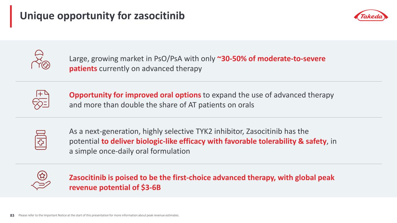 Large, growing market in PsO/PsA with only ~30-50% of moderate-to-severe patients currently on advanced therapy Opportunity for improved oral options to expand the use of advanced therapy and more than double the share of AT patients on orals As a next-generation, highly selective TYK2 inhibitor, Zasocitinib has the potential to deliver biologic-like efficacy with favorable tolerability & safety, in a simple once-daily oral formulation Zasocitinib is poised to be the first-choice advanced therapy, with global peak revenue potential of $3-6B Unique opportunity for zasocitinib Please refer to the Important Notice at the start of this presentation for more information about peak revenue estimates.83