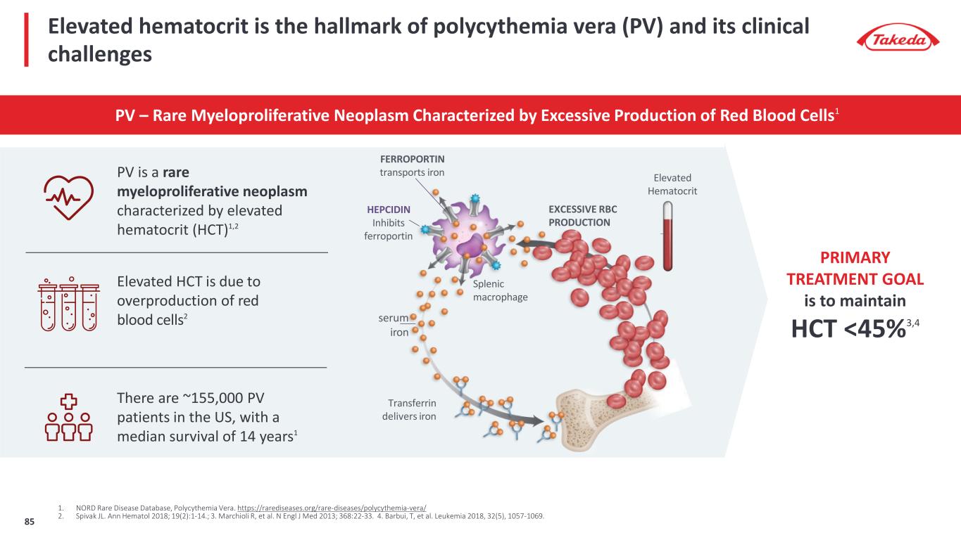 Elevated hematocrit is the hallmark of polycythemia vera (PV) and its clinical challenges PV – Rare Myeloproliferative Neoplasm Characterized by Excessive Production of Red Blood Cells1 FERROPORTIN transports iron HEPCIDIN Inhibits ferroportin serum iron Transferrin delivers iron EXCESSIVE RBC PRODUCTION Elevated Hematocrit Splenic macrophage 1. NORD Rare Disease Database, Polycythemia Vera. https://rarediseases.org/rare-diseases/polycythemia-vera/ 2. Spivak JL. Ann Hematol 2018; 19(2):1-14.; 3. Marchioli R, et al. N Engl J Med 2013; 368:22-33. 4. Barbui, T, et al. Leukemia 2018, 32(5), 1057-1069. PV is a rare myeloproliferative neoplasm characterized by elevated hematocrit (HCT)1,2 Elevated HCT is due to overproduction of red blood cells2 There are ~155,000 PV patients in the US, with a median survival of 14 years1 PRIMARY TREATMENT GOAL is to maintain HCT <45%3,4 85