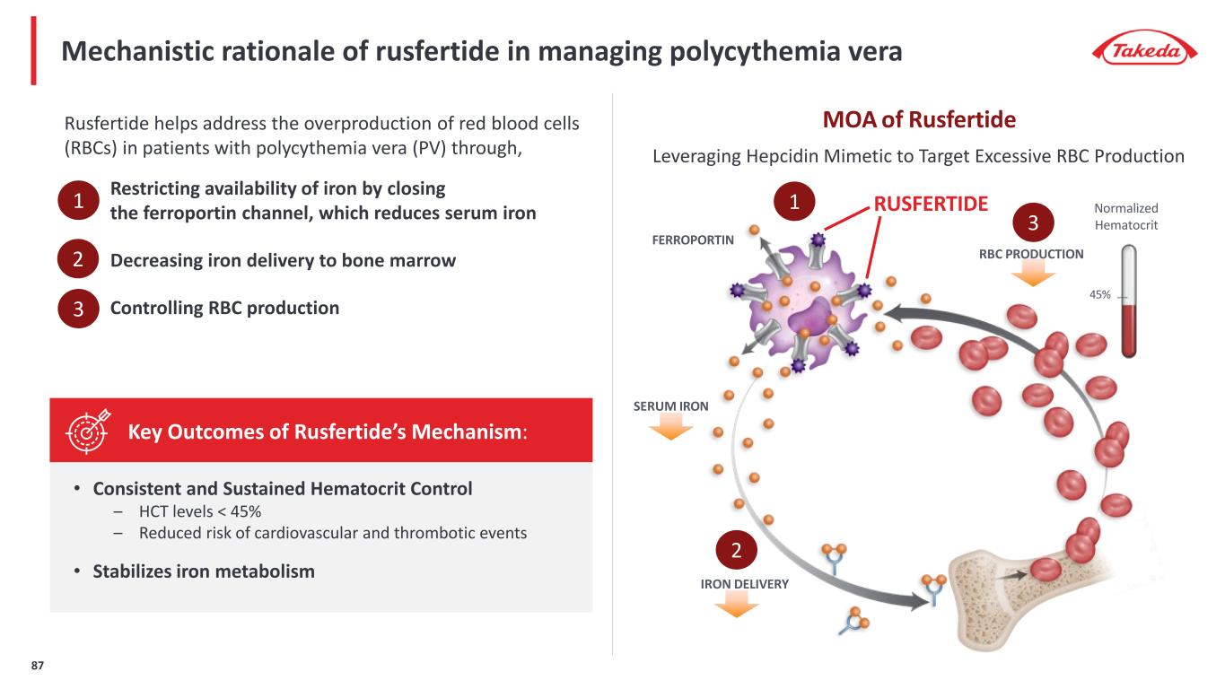 There remains significant unmet need in polycythemia vera treatment Increased Risk of Thrombotic Events Significant BurdenInconsistent HCT Control • Consistent HCT <45% is critical, as uncontrolled HCT is associated with ~4 times higher risk of death from cardiovascular causes or thrombotic events1 • Real-world data shows that 78% of patients have uncontrolled HCT2 • 34-41% of patients experience thrombotic events3-5 • Common events include acute coronary syndrome, stroke, deep vein thrombosis, and pulmonary embolism3,5 • PV impacts daily activities and productivity6 • 84% of patients report fatigue, and 23% report spending full days in bed because of symptoms6 • Patients with PV often present with iron deficiency that can be further exacerbated due to iron loss from phlebotomy7 1. Marchioli R, et al. N Engl J Med 2013; 368:22-33; 2. Verstovsek S, et al. Ann Hematol 2023 Mar;102(3):571-581; 3. Kaifie A, et al. J Hematol Oncol 2016;9:18.; 4. Griesshammer M, et al. Ann Hematol 2019;98(5):1071-1082.; 5. Polycythemia vera: the natural history of 1213 patients followed for 20 years. Gruppo Italiano Studio Policitemia. Ann Intern Med 1995;123(9):656-664.; 6. Mesa R, et al. BMC Cancer 2016;16,167. 7. Ginzburg et al. Leukemia 2018;32:2105-2116. 86