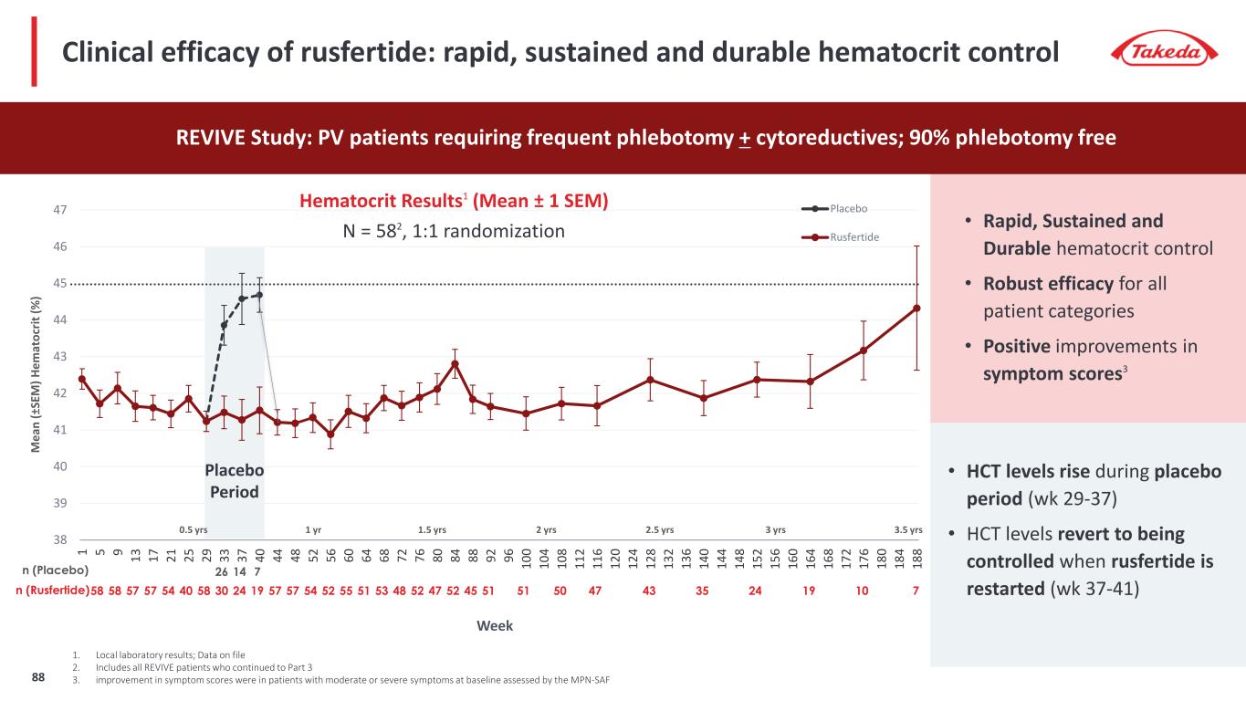 38 39 40 41 42 43 44 45 46 47 1 5 9 1 3 1 7 2 1 2 5 2 9 3 3 3 7 40 44 48 52 56 60 64 68 72 76 80 84 88 92 96 10 0 10 4 10 8 11 2 11 6 12 0 12 4 12 8 13 2 13 6 14 0 14 4 14 8 15 2 15 6 16 0 16 4 16 8 17 2 17 6 18 0 18 4 18 8 Placebo Rusfertide M ea n (± SE M ) H em at oc rit (% ) Week 0.5 yrs 1 yr 1.5 yrs 2 yrs 2.5 yrs 3 yrs 3.5 yrs Clinical efficacy of rusfertide: rapid, sustained and durable hematocrit control • Rapid, Sustained and Durable hematocrit control • Robust efficacy for all patient categories • Positive improvements in symptom scores3 Hematocrit Results1 (Mean ± 1 SEM) N = 582, 1:1 randomization 1. Local laboratory results; Data on file 2. Includes all REVIVE patients who continued to Part 3 3. improvement in symptom scores were in patients with moderate or severe symptoms at baseline assessed by the MPN-SAF REVIVE Study: PV patients requiring frequent phlebotomy + cytoreductives; 90% phlebotomy free • HCT levels rise during placebo period (wk 29-37) • HCT levels revert to being controlled when rusfertide is restarted (wk 37-41) Placebo Period 58 58 57 57 54 40 58 30 24 19 57 57 54 52 55 51 53 48 52 47 52 45 51 51 50 47 43 35 24 19 10 7 26 14 7 n (Rusfertide) n (Placebo) 88