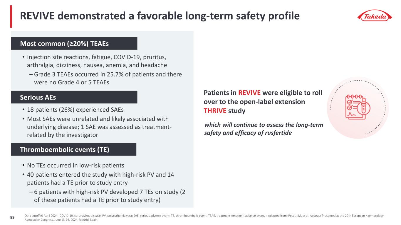 REVIVE demonstrated a favorable long-term safety profile • Injection site reactions, fatigue, COVID-19, pruritus, arthralgia, dizziness, nausea, anemia, and headache – Grade 3 TEAEs occurred in 25.7% of patients and there were no Grade 4 or 5 TEAEs Most common (≥20%) TEAEs • 18 patients (26%) experienced SAEs • Most SAEs were unrelated and likely associated with underlying disease; 1 SAE was assessed as treatment- related by the investigator Serious AEs • No TEs occurred in low-risk patients • 40 patients entered the study with high-risk PV and 14 patients had a TE prior to study entry – 6 patients with high-risk PV developed 7 TEs on study (2 of these patients had a TE prior to study entry) Thromboembolic events (TE) Patients in REVIVE were eligible to roll over to the open-label extension THRIVE study which will continue to assess the long-term safety and efficacy of rusfertide Data cutoff: 9 April 2024; COVID-19, coronavirus disease; PV, polycythemia vera; SAE, serious adverse event; TE, thromboembolic event; TEAE, treatment-emergent adverse event. ; Adapted from: Pettit KM, et al. Abstract Presented at the 29th European Haemotology Association Congress, June 13-16, 2024, Madrid, Spain. 89