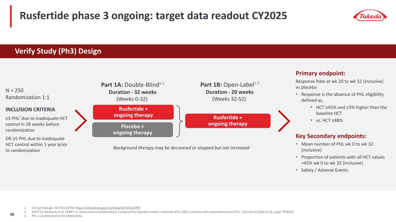 Rusfertide phase 3 ongoing: target data readout CY2025 N = 250 Randomization 1:1 INCLUSION CRITERIA ≥3 PHL3 due to inadequate HCT control in 28 weeks before randomization OR ≥5 PHL due to inadequate HCT control within 1 year prior to randomization Part 1B: Open-Label1, 2 Duration - 20 weeks (Weeks 32-52) Placebo + ongoing therapy Rusfertide + ongoing therapy Rusfertide + ongoing therapy Background therapy may be decreased or stopped but not increased Primary endpoint: Response Rate at wk 20 to wk 32 (inclusive) vs placebo • Response is the absence of PHL eligibility defined as, • HCT ≥45% and ≥3% higher than the baseline HCT • or, HCT ≥48% Key Secondary endpoints: • Mean number of PHL wk 0 to wk 32 (inclusive) • Proportion of patients with all HCT values <45% wk 0 to wk 32 (inclusive) • Safety / Adverse Events Part 1A: Double-Blind1, 2 Duration - 32 weeks (Weeks 0-32) 1. ClinicalTrials.gov. NCT05210790. https://clinicaltrials.gov/ct2/show/NCT05210790 2. ASCO’24: Bankar A, et al. VERIFY: A randomized controlled phase 3 study of the hepcidin mimetic rusfertide (PTG-300) in patients with polycythemia vera (PV). J Clin Oncol;2024;42;16_suppl. TPS6592 3. PHL is an abbreviation for phlebotomy. Verify Study (Ph3) Design 90