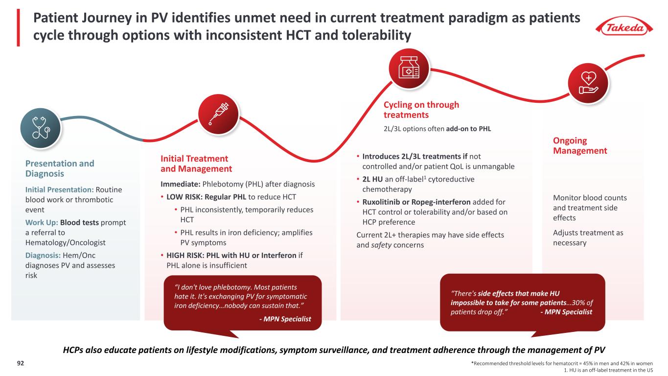 Patient Journey in PV identifies unmet need in current treatment paradigm as patients cycle through options with inconsistent HCT and tolerability Initial Presentation: Routine blood work or thrombotic event Work Up: Blood tests prompt a referral to Hematology/Oncologist Diagnosis: Hem/Onc diagnoses PV and assesses risk Immediate: Phlebotomy (PHL) after diagnosis • LOW RISK: Regular PHL to reduce HCT • PHL inconsistently, temporarily reduces HCT • PHL results in iron deficiency; amplifies PV symptoms • HIGH RISK: PHL with HU or Interferon if PHL alone is insufficient Initial Treatment and Management Monitor blood counts and treatment side effects Adjusts treatment as necessary Ongoing Management Presentation and Diagnosis 2L/3L options often add-on to PHL Cycling on through treatments HCPs also educate patients on lifestyle modifications, symptom surveillance, and treatment adherence through the management of PV “I don't love phlebotomy. Most patients hate it. It's exchanging PV for symptomatic iron deficiency…nobody can sustain that.” - MPN Specialist “There's side effects that make HU impossible to take for some patients…30% of patients drop off.” - MPN Specialist • Introduces 2L/3L treatments if not controlled and/or patient QoL is unmangable • 2L HU an off-label1 cytoreductive chemotherapy • Ruxolitinib or Ropeg-interferon added for HCT control or tolerability and/or based on HCP preference Current 2L+ therapies may have side effects and safety concerns *Recommended threshold levels for hematocrit = 45% in men and 42% in women 1. HU is an off-label treatment in the US 92