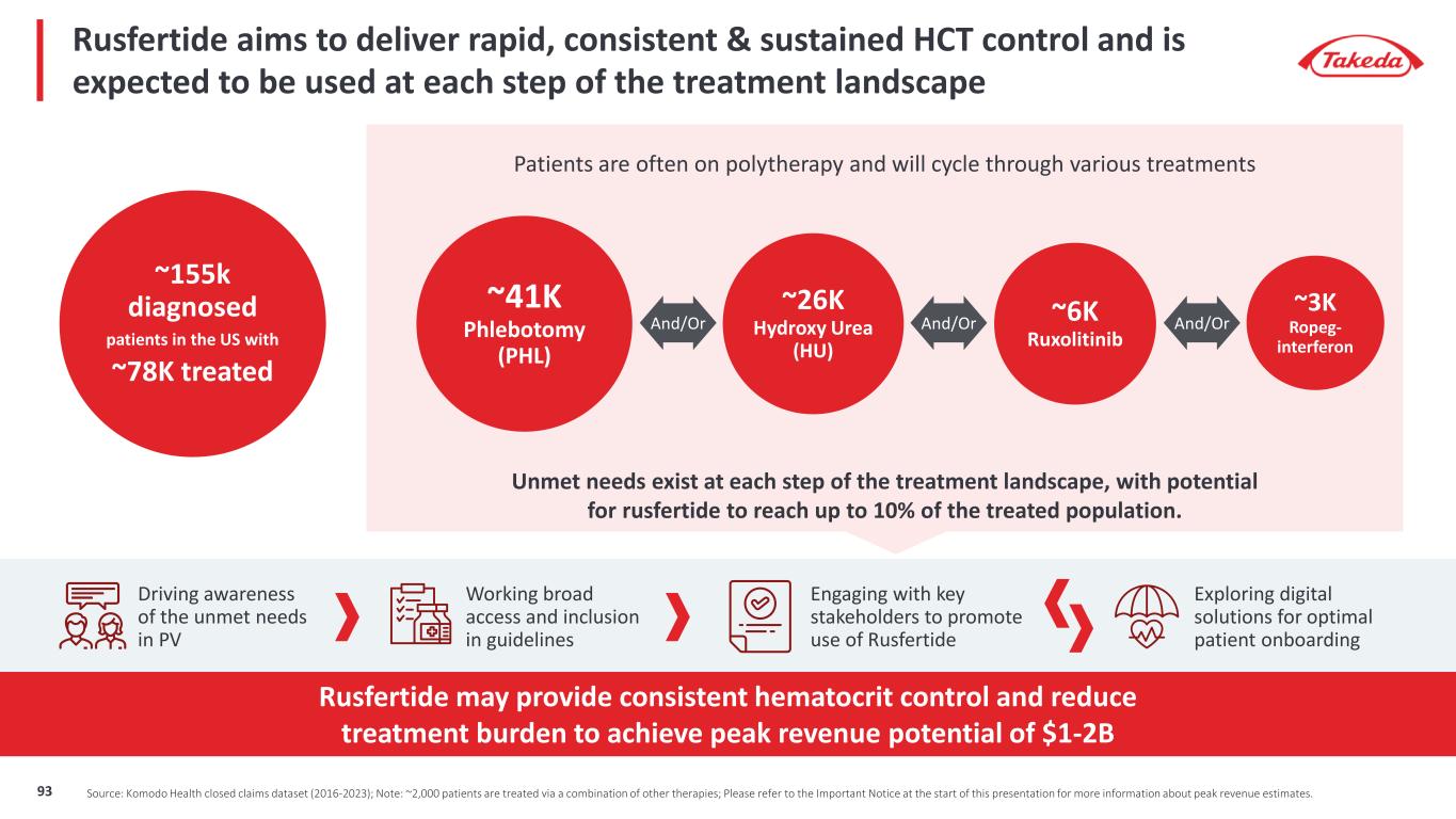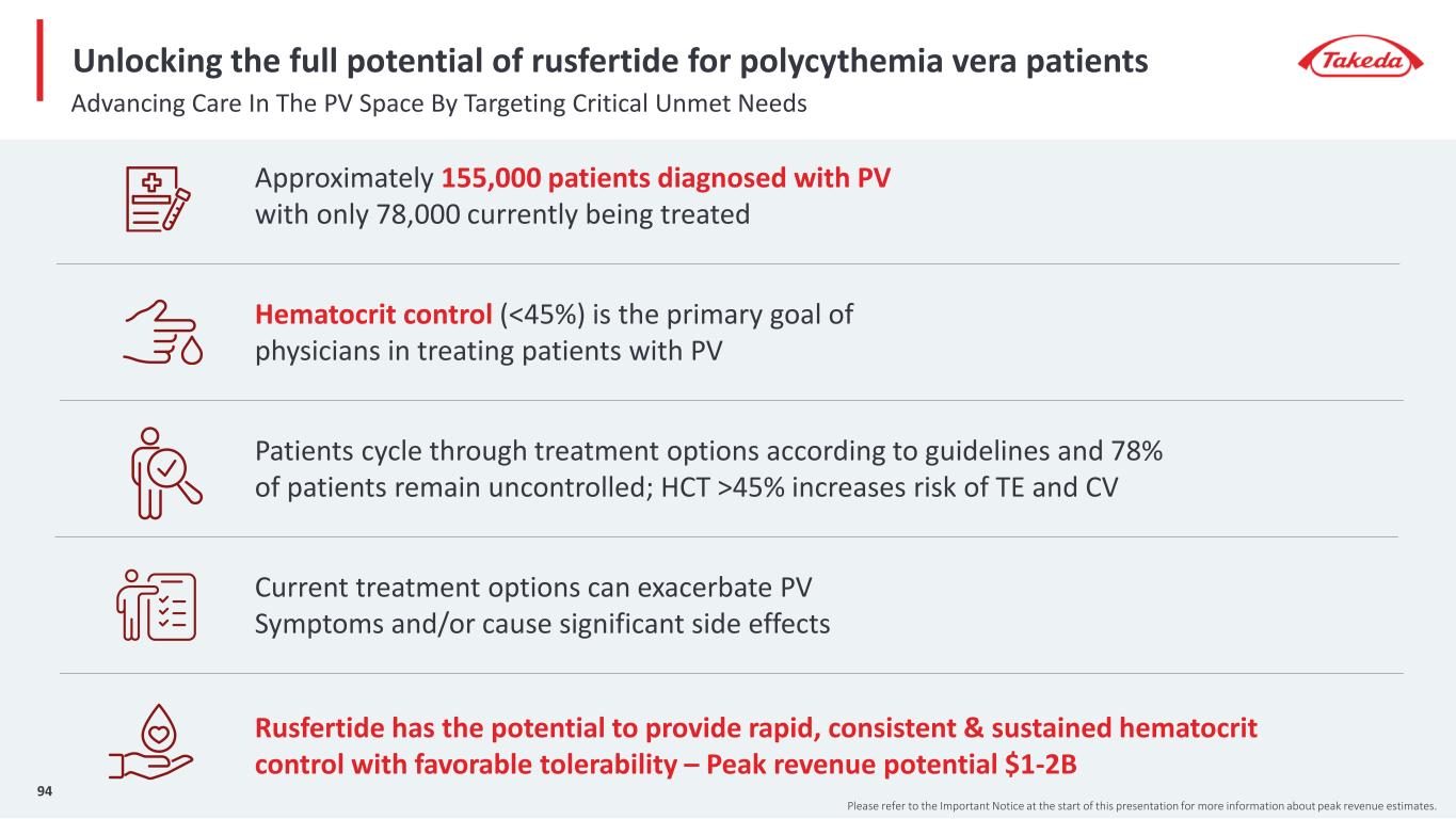 Rusfertide aims to deliver rapid, consistent & sustained HCT control and is expected to be used at each step of the treatment landscape Engaging with key stakeholders to promote use of Rusfertide Working broad access and inclusion in guidelines Driving awareness of the unmet needs in PV Exploring digital solutions for optimal patient onboarding ~155k diagnosed patients in the US with ~78K treated ~41K Phlebotomy (PHL) ~26K Hydroxy Urea (HU) ~6K Ruxolitinib ~3K Ropeg- interferon And/Or And/Or And/Or 93 Source: Komodo Health closed claims dataset (2016-2023); Note: ~2,000 patients are treated via a combination of other therapies; Please refer to the Important Notice at the start of this presentation for more information about peak revenue estimates. Rusfertide may provide consistent hematocrit control and reduce treatment burden to achieve peak revenue potential of $1-2B Unmet needs exist at each step of the treatment landscape, with potential for rusfertide to reach up to 10% of the treated population. Patients are often on polytherapy and will cycle through various treatments
