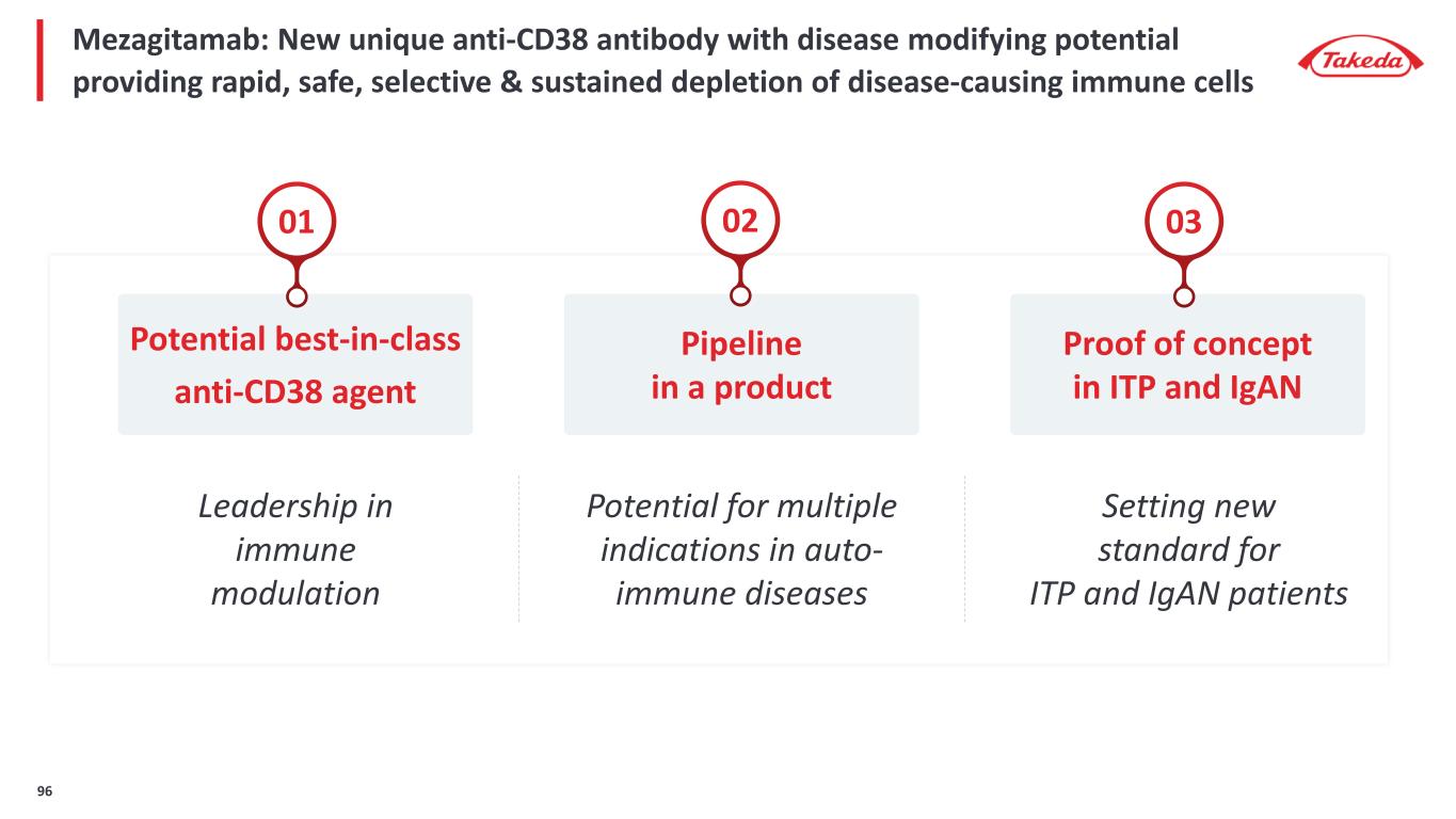 Potential best-in-class anti-CD38 agent Leadership in immune modulation Pipeline in a product Proof of concept in ITP and IgAN Potential for multiple indications in auto- immune diseases Setting new standard for ITP and IgAN patients Mezagitamab: New unique anti-CD38 antibody with disease modifying potential providing rapid, safe, selective & sustained depletion of disease-causing immune cells 01 02 03 96
