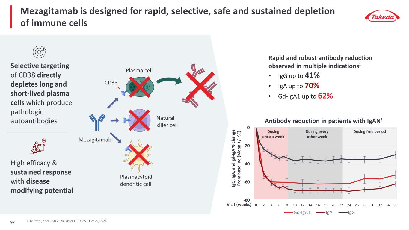 Mezagitamab is designed for rapid, selective, safe and sustained depletion of immune cells Rapid and robust antibody reduction observed in multiple indications1 • IgG up to 41% • IgA up to 70% • Gd-IgA1 up to 62% -80 -60 -40 -20 0 0 2 4 6 8 10 12 14 16 18 20 22 24 26 28 30 32 34 36 Ig G , I gA , a nd g d- Ig A % c ha ng e Fr om b as el in e (M ea n +/ - S E) Visit (weeks) Gd-IgA1 IgA IgG Dosing free periodDosing once a week Dosing every other week Antibody reduction in patients with IgAN1 1. Barratt J, et al. ASN 2024 Poster FR-PO857, Oct 25, 2024 Selective targeting of CD38 directly depletes long and short-lived plasma cells which produce pathologic autoantibodies High efficacy & sustained response with disease modifying potential Plasmacytoid dendritic cell Natural killer cell Plasma cell Mezagitamab CD38 97
