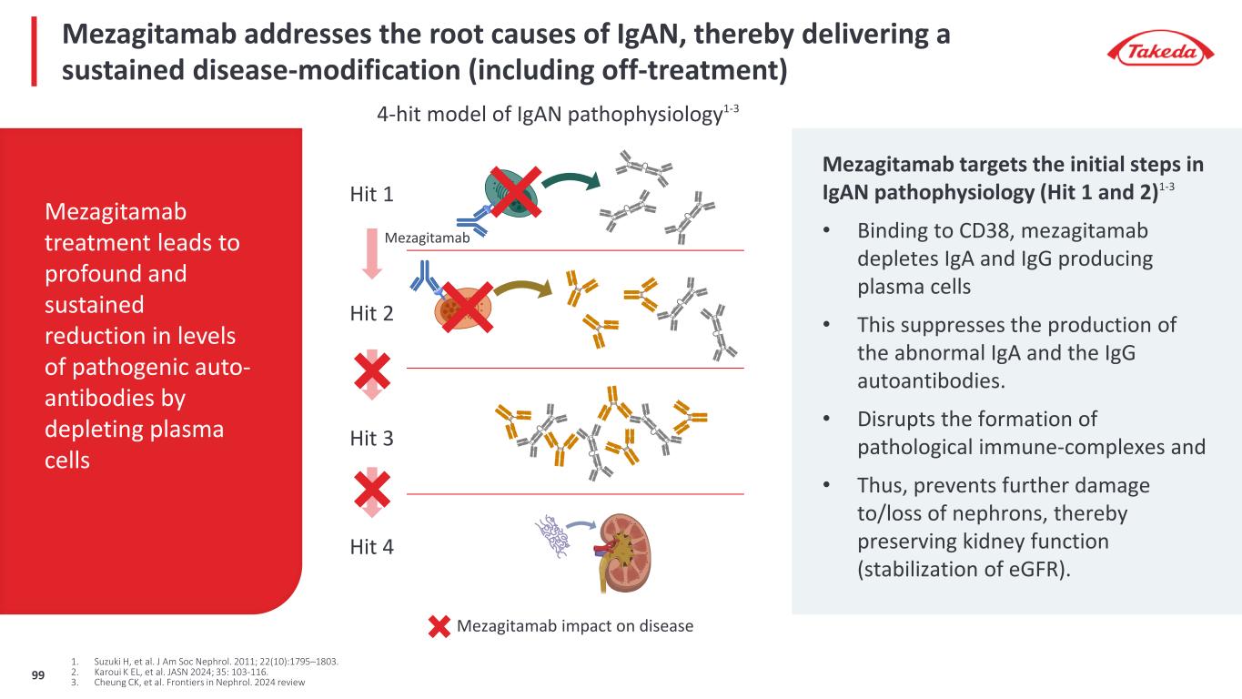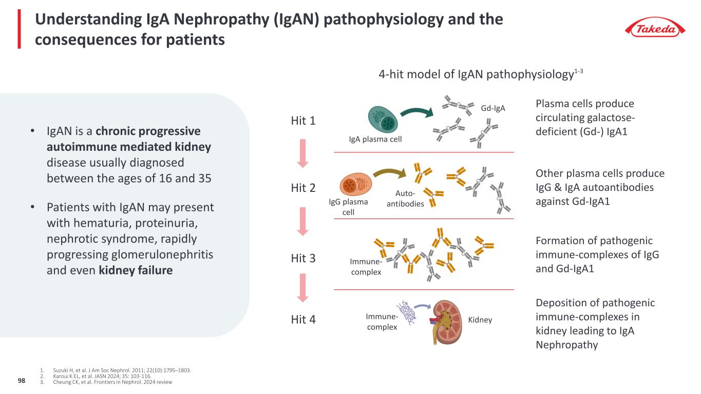 Understanding IgA Nephropathy (IgAN) pathophysiology and the consequences for patients Hit 2 Hit 3 Hit 4 Hit 1 Plasma cells produce circulating galactose- deficient (Gd-) IgA1 Other plasma cells produce IgG & IgA autoantibodies against Gd-IgA1 Deposition of pathogenic immune-complexes in kidney leading to IgA Nephropathy Formation of pathogenic immune-complexes of IgG and Gd-IgA1 • IgAN is a chronic progressive autoimmune mediated kidney disease usually diagnosed between the ages of 16 and 35 • Patients with IgAN may present with hematuria, proteinuria, nephrotic syndrome, rapidly progressing glomerulonephritis and even kidney failure 4-hit model of IgAN pathophysiology1-3 1. Suzuki H, et al. J Am Soc Nephrol. 2011; 22(10):1795–1803. 2. Karoui K EL, et al. JASN 2024; 35: 103-116. 3. Cheung CK, et al. Frontiers in Nephrol. 2024 review IgA plasma cell IgG plasma cell Gd-IgA Auto- antibodies Immune- complex Immune- complex Kidney 98