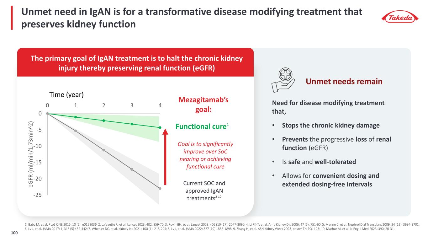 Mezagitamab addresses the root causes of IgAN, thereby delivering a sustained disease-modification (including off-treatment) Mezagitamab targets the initial steps in IgAN pathophysiology (Hit 1 and 2)1-3 • Binding to CD38, mezagitamab depletes IgA and IgG producing plasma cells • This suppresses the production of the abnormal IgA and the IgG autoantibodies. • Disrupts the formation of pathological immune-complexes and • Thus, prevents further damage to/loss of nephrons, thereby preserving kidney function (stabilization of eGFR). 1. Suzuki H, et al. J Am Soc Nephrol. 2011; 22(10):1795–1803. 2. Karoui K EL, et al. JASN 2024; 35: 103-116. 3. Cheung CK, et al. Frontiers in Nephrol. 2024 review Mezagitamab treatment leads to profound and sustained reduction in levels of pathogenic auto- antibodies by depleting plasma cells Mezagitamab impact on disease Hit 2 Hit 3 Hit 4 Hit 1 Mezagitamab 4-hit model of IgAN pathophysiology1-3 99