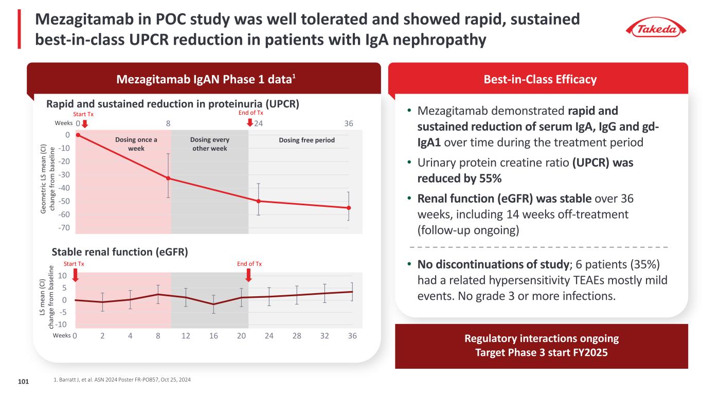 Mezagitamab in POC study was well tolerated and showed rapid, sustained best-in-class UPCR reduction in patients with IgA nephropathy • Mezagitamab demonstrated rapid and sustained reduction of serum IgA, IgG and gd- IgA1 over time during the treatment period • Urinary protein creatine ratio (UPCR) was reduced by 55% • Renal function (eGFR) was stable over 36 weeks, including 14 weeks off-treatment (follow-up ongoing) • No discontinuations of study; 6 patients (35%) had a related hypersensitivity TEAEs mostly mild events. No grade 3 or more infections. Mezagitamab IgAN Phase 1 data1 Best-in-Class Efficacy Rapid and sustained reduction in proteinuria (UPCR) Regulatory interactions ongoing Target Phase 3 start FY2025 Stable renal function (eGFR) Start Tx End of Tx Weeks Weeks 1. Barratt J, et al. ASN 2024 Poster FR-PO857, Oct 25, 2024 Ge om et ric L S m ea n (C I) ch an ge fr om b as el in e -10 -5 0 5 10 0 2 4 8 12 16 20 24 28 32 36 -70 -60 -50 -40 -30 -20 -10 0 0 8 24 36 LS m ea n (C I) ch an ge fr om b as el in e Start Tx End of Tx Dosing free periodDosing once a week Dosing every other week 101