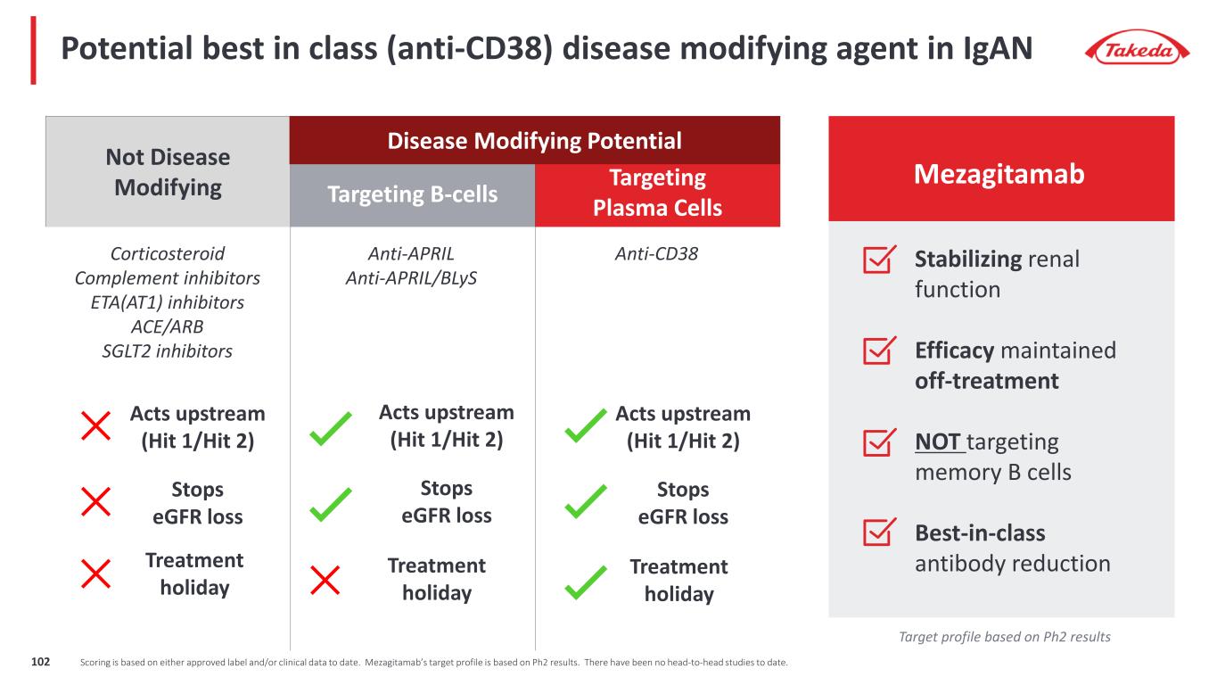 Potential best in class (anti-CD38) disease modifying agent in IgAN Not Disease Modifying Targeting B-cells Targeting Plasma Cells Stabilizing renal function Efficacy maintained off-treatment NOT targeting memory B cells Best-in-class antibody reduction Mezagitamab Disease Modifying Potential Corticosteroid Complement inhibitors ETA(AT1) inhibitors ACE/ARB SGLT2 inhibitors Anti-APRIL Anti-APRIL/BLyS Anti-CD38 Acts upstream (Hit 1/Hit 2) Acts upstream (Hit 1/Hit 2) Acts upstream (Hit 1/Hit 2) Stops eGFR loss Stops eGFR loss Stops eGFR loss Treatment holiday Treatment holiday Treatment holiday Target profile based on Ph2 results Scoring is based on either approved label and/or clinical data to date. Mezagitamab’s target profile is based on Ph2 results. There have been no head-to-head studies to date.102