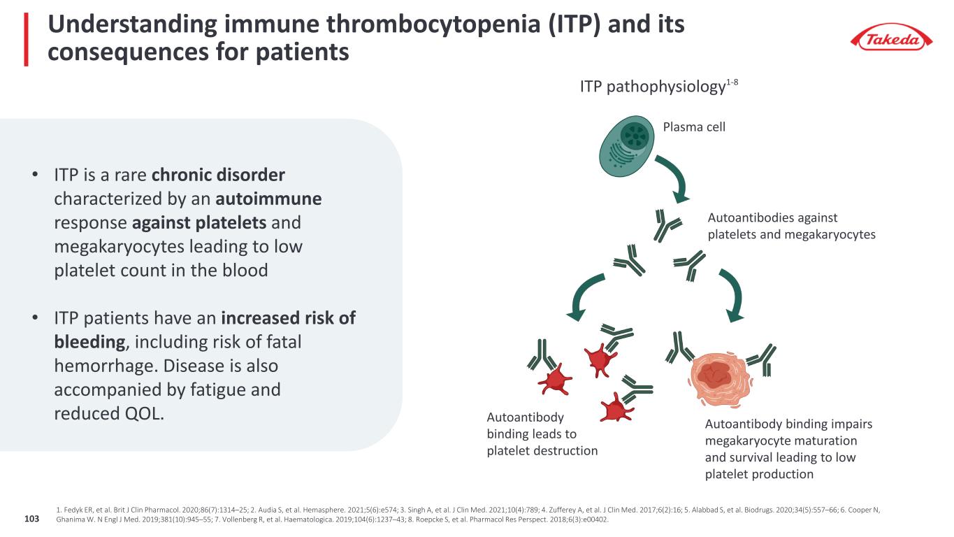 Understanding immune thrombocytopenia (ITP) and its consequences for patients • ITP is a rare chronic disorder characterized by an autoimmune response against platelets and megakaryocytes leading to low platelet count in the blood • ITP patients have an increased risk of bleeding, including risk of fatal hemorrhage. Disease is also accompanied by fatigue and reduced QOL. 1. Fedyk ER, et al. Brit J Clin Pharmacol. 2020;86(7):1314–25; 2. Audia S, et al. Hemasphere. 2021;5(6):e574; 3. Singh A, et al. J Clin Med. 2021;10(4):789; 4. Zufferey A, et al. J Clin Med. 2017;6(2):16; 5. Alabbad S, et al. Biodrugs. 2020;34(5):557–66; 6. Cooper N, Ghanima W. N Engl J Med. 2019;381(10):945–55; 7. Vollenberg R, et al. Haematologica. 2019;104(6):1237–43; 8. Roepcke S, et al. Pharmacol Res Perspect. 2018;6(3):e00402. ITP pathophysiology1-8 Plasma cell Autoantibodies against platelets and megakaryocytes Autoantibody binding leads to platelet destruction Autoantibody binding impairs megakaryocyte maturation and survival leading to low platelet production 103