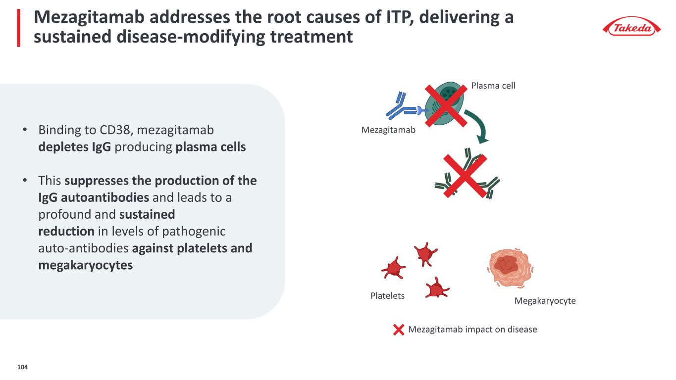 Mezagitamab addresses the root causes of ITP, delivering a sustained disease-modifying treatment • Binding to CD38, mezagitamab depletes IgG producing plasma cells • This suppresses the production of the IgG autoantibodies and leads to a profound and sustained reduction in levels of pathogenic auto-antibodies against platelets and megakaryocytes Megakaryocyte Mezagitamab Platelets Mezagitamab impact on disease Plasma cell 104