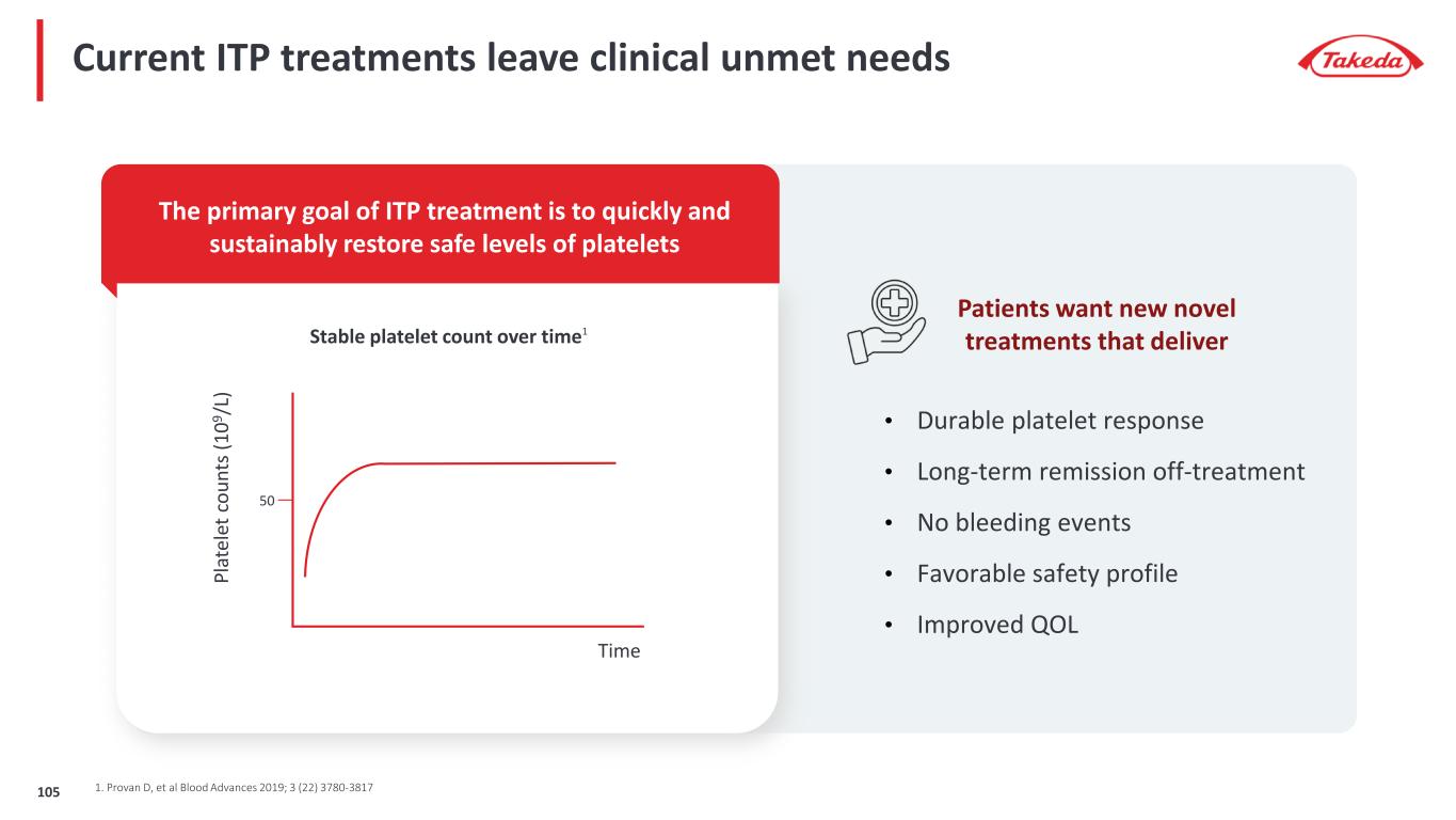 The primary goal of ITP treatment is to quickly and sustainably restore safe levels of platelets Current ITP treatments leave clinical unmet needs Stable platelet count over time1 Pl at el et c ou nt s ( 10 9 / L) Patients want new novel treatments that deliver • Durable platelet response • Long-term remission off-treatment • No bleeding events • Favorable safety profile • Improved QOL 50 Time 1. Provan D, et al Blood Advances 2019; 3 (22) 3780-3817105